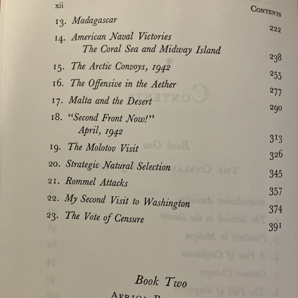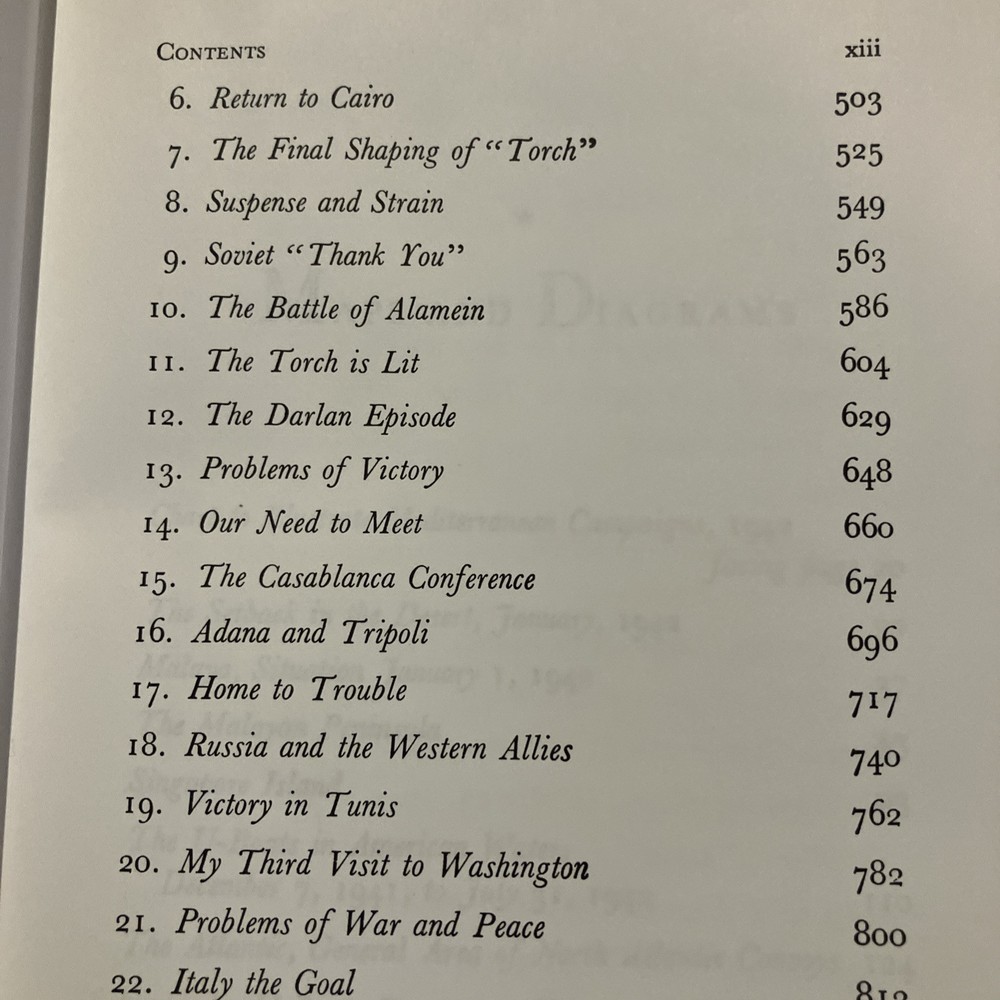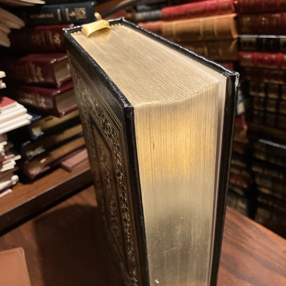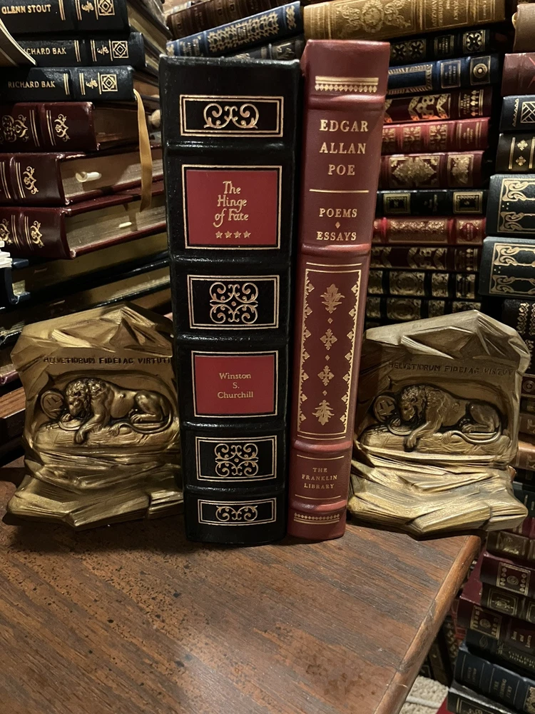 Easton Press leather edition of Winston Churchill's "The Hinge of Fate," a COLLECTOR'S edition, Illustrated with Maps, published in 1989. Bound in deep hunter green leather, the book has camel tan French moire silk end leaves, satin book marker, Symth-sewn binding, printed on archival, acid-free paper, hubbed spine, gold gilding on three edges---in near FINE condition. Sir Winston Leonard Spencer Churchill, who lived from 1874--1965, was the eldest son of Lord Randolph Churchill, the seventh duke of Marlborough. Churchill served in the army in 1895 in Cuba, India, Tirah and Egypt. He was undersecretary for the colonies, 1906-08, first lord of the Admiralty, 1911-1915; secretary of war, 1918-21; and chancellor of the exchequer 1924-29; and prime minister, 1940-45 and 1951-55. "I expect that the Battle of Britain is about to begin," declared Winston Churchill in June 1940. "Upon this battle depends the survival of Christian civilization. . . .Hitler knows that he will have to break us in this island or lose the war. . . Let us therefore brace ourselves to our duties, and so bear ourselves that, if the British Empire and its Commonwealth last for a thousand years, men will say, 'This was their finest hour.' Churchill wrote: "The new year of the Second World War, 1942, opened upon us in an entirely different shape for Britain. We were no longer alone. At our side stood two mighty Allies. Russia and the United States were engaged to fight to the death in the closet concert with the British Empire." In the Preface, Churchill wrote: "In 1942, President FRANKLIN ROOSEVELT and I, supported by our Chief Military and Naval Advisers, proclaimed THE GRAND ALLIANCE, and prescribed the main strategy for the future conduct of the war. We had now to face the onslaught of Japan." The Japanese had overrun the whole of Malays except Jahore. Pride and patriotism are evident in Churchill's dramatic account. Having learned a lesson at Munich that they would never forget, the British refused to make peace with Adolph Hitler, defying him even after France had fallen and after it seemed as though the Nazis were unstoppable. Churchill remained unbowed throughout, as did the people of Britain. Strategies were developed to respond to Hitler's ruthless conquest of Europe, his planned invasion of England, and his treacherous assault on Russia. Germany, Italy and Japan continued pressing forward with their terrible onslaught. The Grand Alliance eventually overwhelmed the Red Army and Rommel in the war in the desert and Singapore which fell to Japan. Victories at Midway and Guadalcanal boosted confidence. A few of the Chapter titles include: "Australian Anxieties," "The Setback in the Desert," "Penalties in Malaya," "A Vote of Confidence," "Cabinet Changes," "The Fall of Singapore," "The U-Boat Paradise," "The Loss of the Dutch East Indies," "The invasion of Burma," "Ceylon and the Bay of Bengal," "The Shipping Stranglehold," "India---the Cripps Mission," "My Journey to Cairo," "The Molotow Visit," "American Naval Victories: The Coral Sea and Midway Island," "Malta and the Desert," "Moscow: A Relationship Established," "The Casablanca Conference," "Russia and the Western Allies," "Victory in Tunis," "My Third Visit to Washington," "Italy the Goal," "Problems of War and Peace." Some of the personalities of the period included: Clement Attlee, General Auschinleck, Harold Alexander, Rommel, Lord Beaverbrook, Alan Brooke, Alexander Cadogan, Winston Churchill, Mark Clark, Admiral Darlan, Charles De Gaulle, Dwight Eisenhower, Antony Eden, George VI, General Giaud, Adolph Hitler, Harry Hopkins, Hastings Ismay, Ernest King, Lord Frederick Leathers, General George Marshall, General Bernard Montgomery, Vyacheslav Molotov, Admiral Lord Louis Mountbatten, Benito Mussolini, General Percival, General George S. Patton, Admiral Pound, Joseph Stalin, General Joseph Stilwell, Marshall Wavell, Admiral Yomamoto, and General Weygand. "Hinge of Fate" is the fourth Churchill book about World War 2. Churchill said he named this volume such because in it we turn from almost uninterrupted disaster to almost unbroken success. For the first six months of this story all went ill; for the last six months everything went well. And this agreeable change continued to the end of the struggle." Winston Churchill was awarded the NOBEL PRIZE in 1953----and this work was one that was cited! 1000 pages, including Appendix, and an index. I offer combine d shipping.