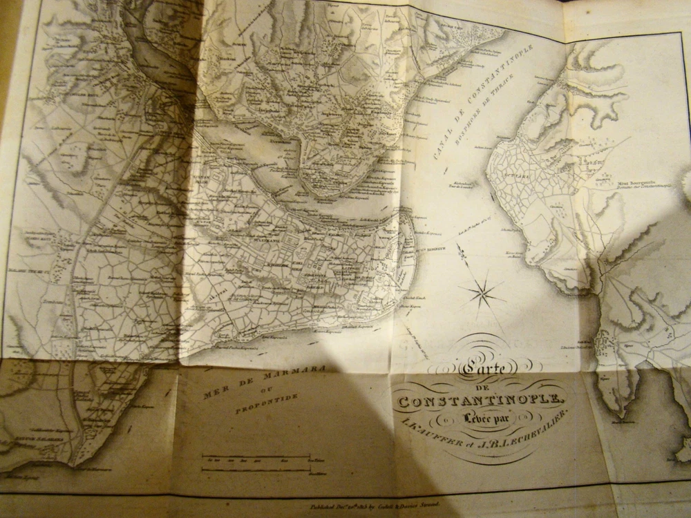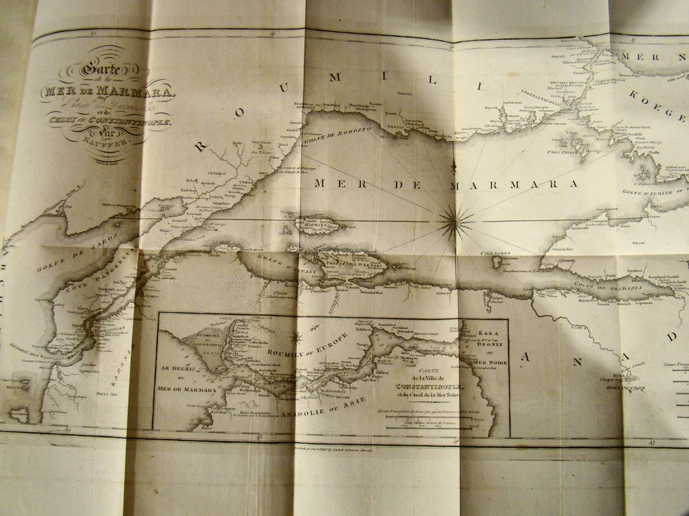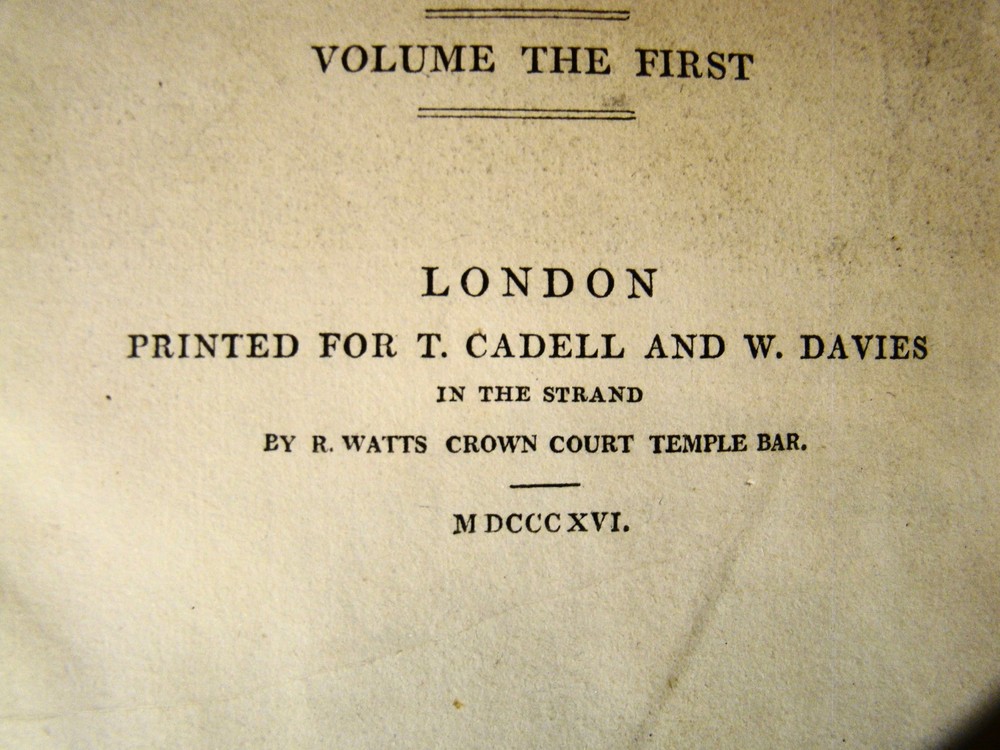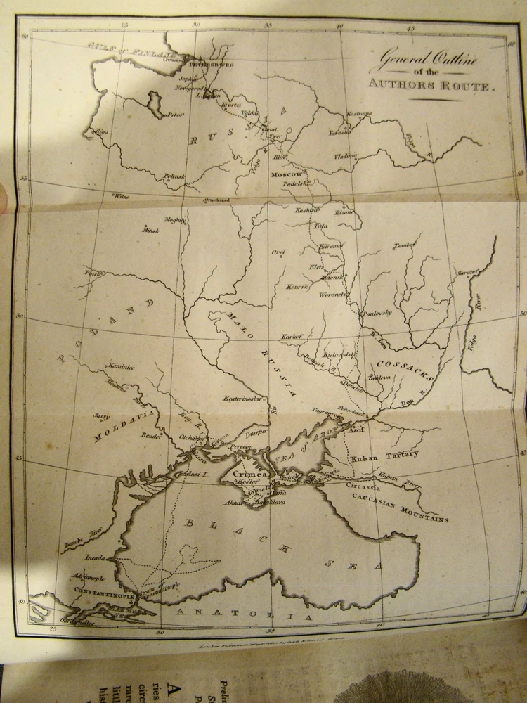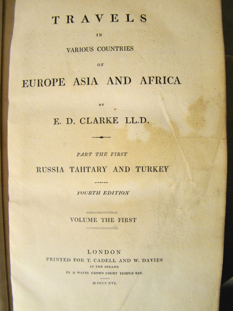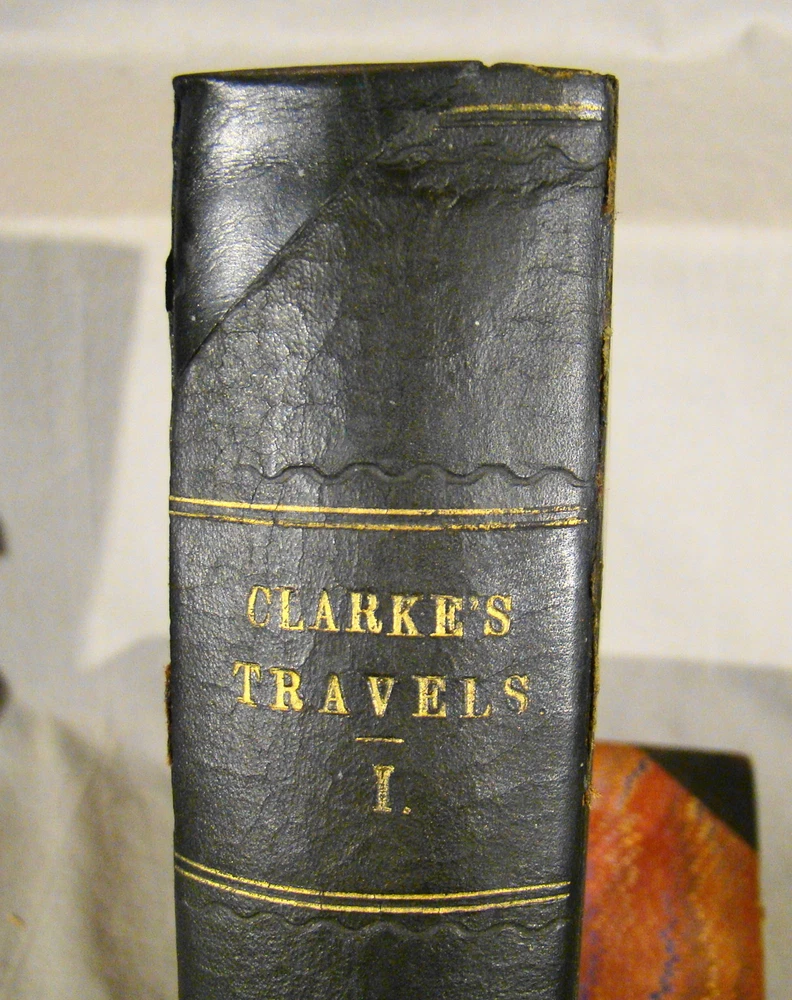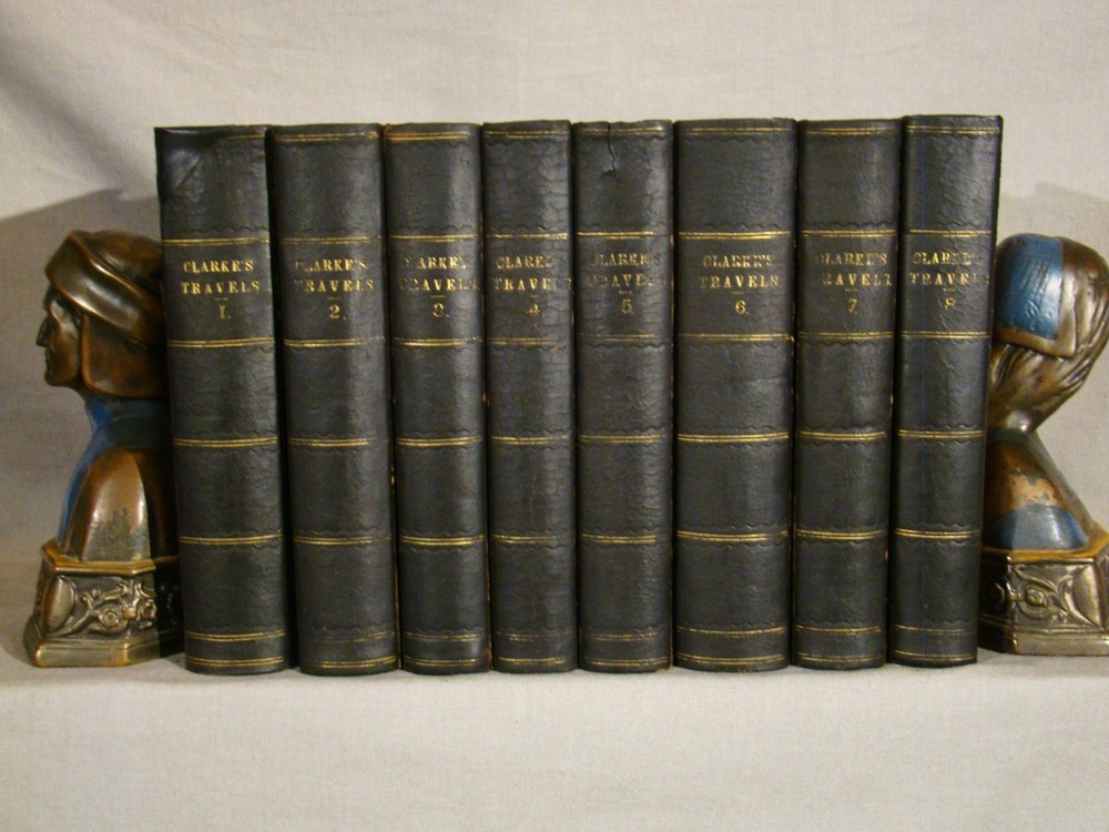 Travels in Various Countries of Europe Asia and Africa. 8 volumes 1816-1818. Clarke, E. D. London: T. Cadell and W. Davies, 1816-1818. 4th edition, 8vols, 8vo (8½” x 5½”), pp. I. (18), xi, (11), (1)-533, (3), engraved portrait, 2 engraved folding maps; II. (10), (1)-524, (20), 2 large engraved folding maps; III. xxvii, (9), (1)-453, (1), 5 engraved folding maps, 2 engraved folding plates, one hand-colored; IV. (10), (1)-463, (1); V. xxvii, (9), (1)-460, 8 engraved folding plates; VI. (14), (1)-647, (1), large engraved folding map; VII. (4), (i)-xxvi, (12), (1)-478, 3 engraved folding maps, folding engraved plate; VIII. (16), (1)-462, (62) index. The folding Plan of Jerusalem called for in vol 4 to face the title is bound in vol 3 at p. 326. The folding General Outline of the Route called for in vol 5 to face the title is bound in vol 6 opposite the title. The folding plate called for in vol 6 to be opposite p.458 is bound in vol 5 opposite p. 220. The folding chart of the Sea of Marmoura called for in vol 8 to face the title is bound in vol 7 at the rear. The folding Topographical Chart of the City of Constantinople called for in vol 8 to face p. 186 is bound in vol 7 at the rear. The Map of the Situation at Tcherkask and the Map of the Mouths of the Don called for in vol 1 to face p. 348 and p. 339 respectively are not present as such but appear to have been replaced by the uncalled for folding map of the Province of Rastof. The latter is not called for in any volume by that title but is certainly a map made for the present work. The folding General Outline of the Author’s Route called for in vol 8 to be at the rear of that volume is not present, but there are two folding maps of the General Outline of the Author’s Route and the General Outline of the Route in vols 3 and 5 respectively as called for in those volumes.) In all there are 13 engraved folding maps or charts, 11 engraved folding plates (pictorial or diagrammatic) , and an engraved portrait plate of the author. There are also 103 wood engraved vignettes (maps, diagrams, or pictures) as called for in the eight volumes. Old half black calf & marbled boards, smooth backs in five gilt compartments, gilt lettered in the second, all edges sprinkled red. Very good set with unusually crisp clean sheets & maps, some mild age toning & very light occasional foxing, darkening to some plates, good calf repair at head of vol 1, some joints cracked but tight & all holding well. H8069 All Items Are Sent Insured. Insurance charges are included in the Shipping & Handling Charges. International buyers please be aware that we are not responsible for and do not include or estimate customs duties, fees or taxes in any way in our listings. We ship all orders within 5 days of cleared payment. We do not create and are not responsible for shipping times or delays associated with customs and international shipping. All Items Are Sent Insured. Insurance charges are included in the Shipping & Handling Charges.