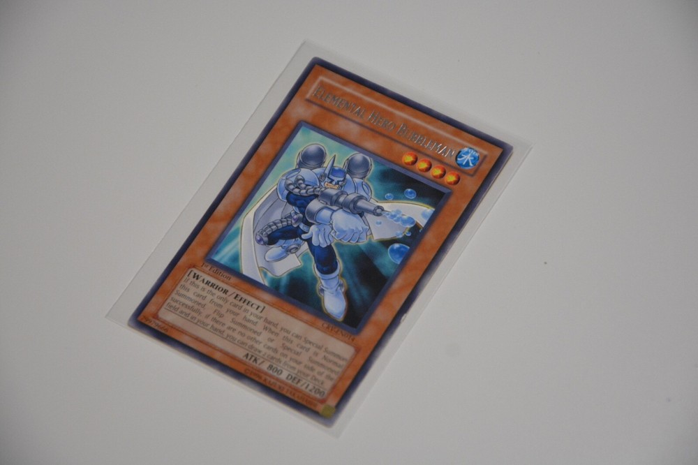 Elemental HERO Bubbleman card depicting a blue warrior wielding dual water guns against a vibrant aqua background. Type: Warrior/Effect. Good condition, tear to the right side of the card. Comes with a protective sleeve and top-loader for safekeeping.