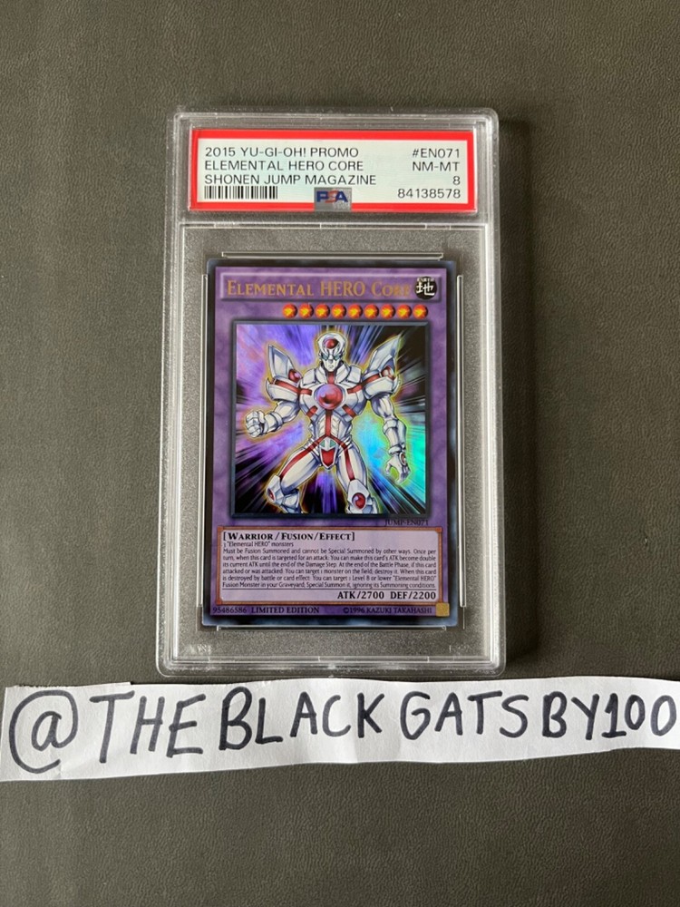 This ultra rare Elemental HERO Core card, with the limited edition JUMP-EN071 code, is a must-have for any Yu-Gi-Oh! TCG collector. It features the powerful Warrior-type monster in an Earth attribute, with Japanese card size and English language. The card comes in PSA 8 NM-MT condition and is perfect for players aged 6 and above. This collectable card is not autographed but nonetheless, a valuable addition to your CCG individual cards collection. Don't miss out on the chance to own this stunning Elemental HERO Core card today!