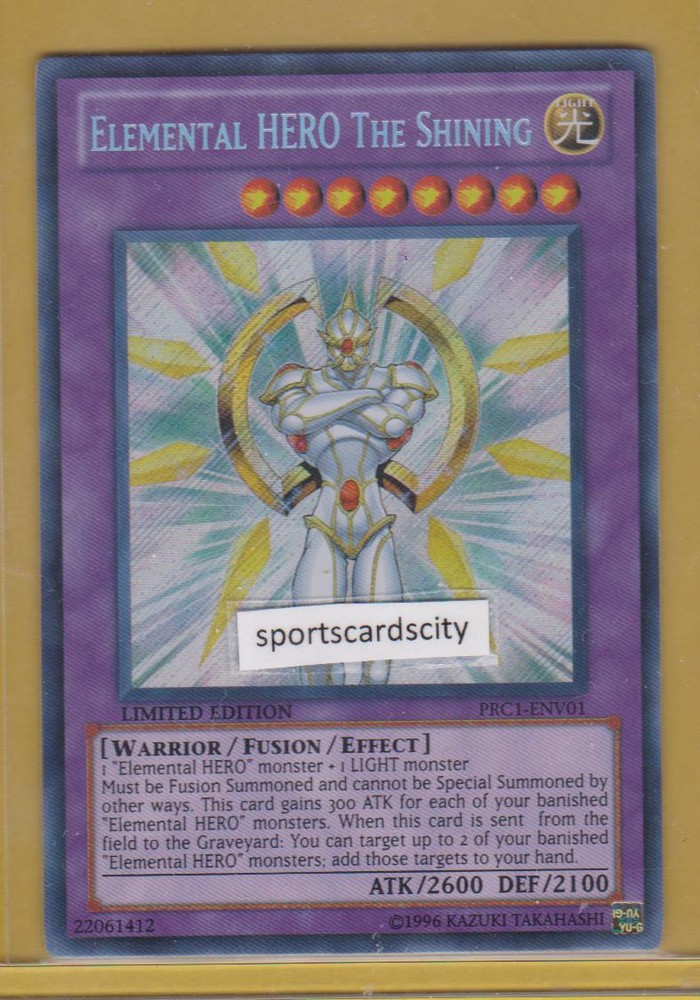 We will ship to Central and South America by Register Mail with tracking number only. Please do not bid if you don't want to pay for register mail with tracking. You are bidding on : 1 x Yu-Gi-Oh - : Premium Collection ELEMENTAL HERO THE SHINING (Secret Rare) (Limited Edition) (Card # PRC1-ENV01) Cards are in stock and ready to ship. This card is an North Amercian Version by Konami. 100% Tournament Legal. ( This card is in Near Mint to Mint condition) Shipping & Payment Methods For Canadian: Shipping for the first card will be $1.49 . ( $11.99 Tracked Package is required on all orders over $60. ) For U.S Buyers: Shipping for the first card will be $2.99 . ($7.99 with US tracked package is required on all orders over $19.99 ) Please contact us for combined shipping if interested in purchasing multiple cards before paying. For international buyers: Excluding Central and South American and Israel Shipping for the first item will be $4.99 . ($29.99 Register mail with tracking number is required on all orders over $60. ) ($0.50 for each additional item) Please wait for invoice before pay . Cards purchased are packaged with care and shipped in sleeve. double toploaders, team bag with an envelope to ensure safe delivery. Payment method : We reserve our right to cancel any transaction or request to pay for register mail/express mail with tracking number for those : 1, Pay by an Non-Verified or Unregistered Paypal payment, 2, Request to ship to an Unconfirmed Paypal Shipping Address, 3, From an inactive Ebay account which has no activity for over 1 year. I will ship out your item(s) within 48 hours after payment is received. Your payment is expected within 5 days after auction. THANK YOU and HAPPY BIDDING! (stock # Binder - Yellow )