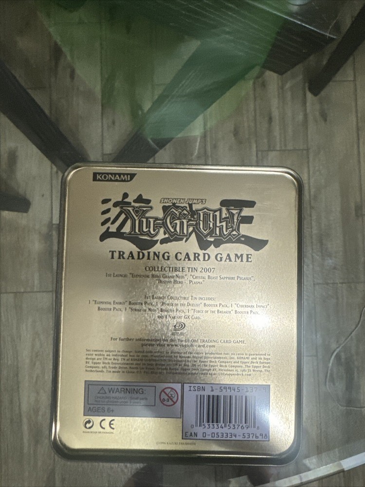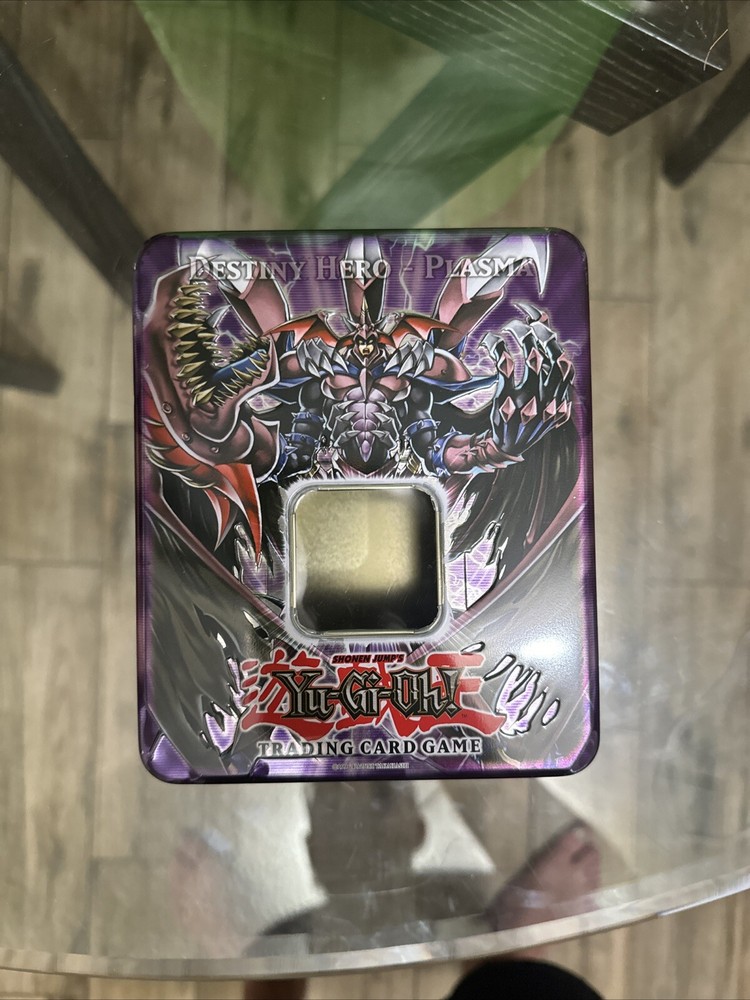 This collectible tin features the Yu-Gi-Oh Shonen Jump's Destiny Hero Plasma design from 2007. The tin is empty, but it is a must-have for any fan of the popular trading card game. The tin is made of durable material and is perfect for storing and organizing your cards. The design is eye-catching and features the iconic Destiny Hero Plasma card. This tin is a great addition to any CCG collection.