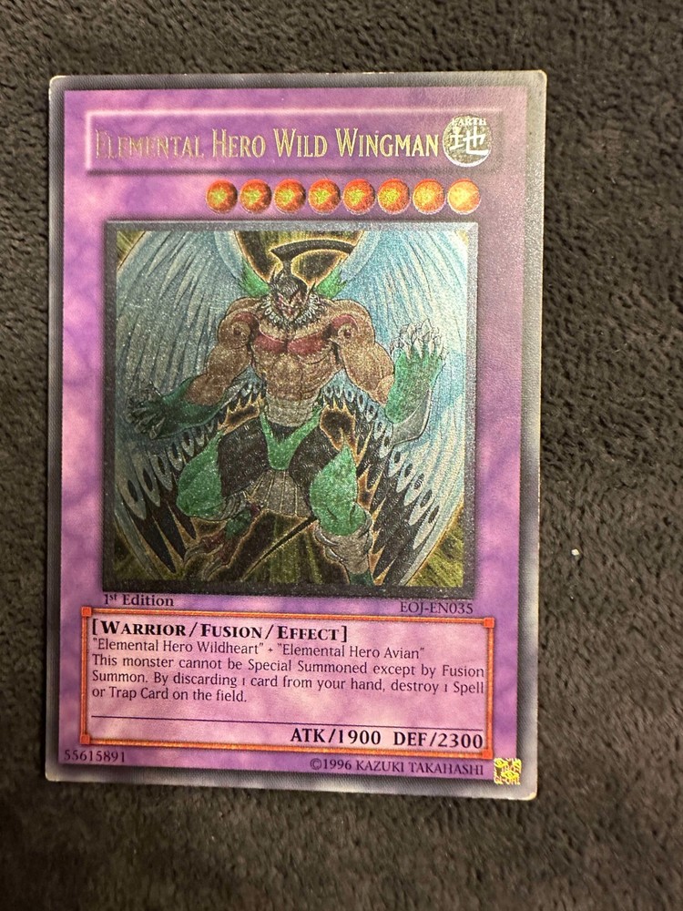 Got this Wild Wingman in LP condition, and it looks fantastic—clean edges, no major flaws. The Ultimate Rare foil really pops, making it a standout in my E-Hero collection. Seller was upfront about condition, and it arrived safely. Definitely worth adding if you're a fan of classic Elemental Heroes!