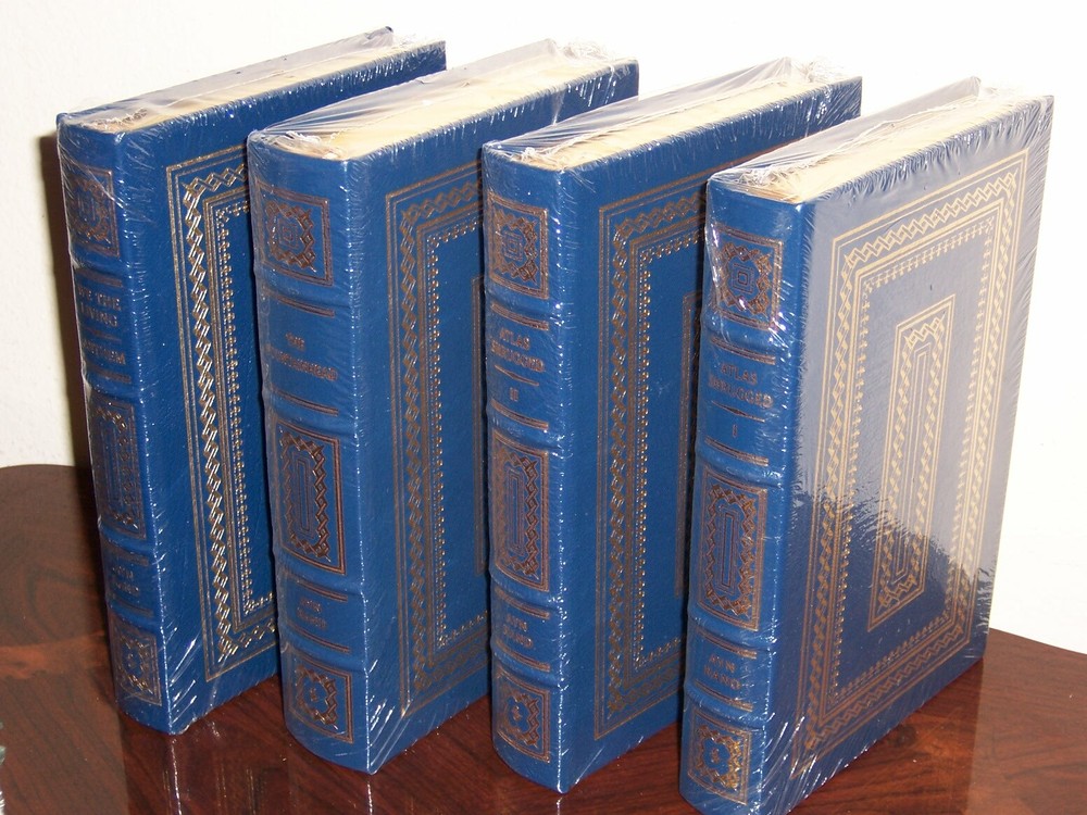 Heirloom Edition Easton Press NOVELS OF AYN RAND in 4 vols by Ayn Rand Blue leather binding with design on the front board exclusive illustrations BOUND IN GENUINE LEATHER Copyright by Easton Press Hubbed Spine, Bound in Premium Full Leather Distinctive Cover Design, Profusely Illustrated Moire Endleaves, Satin Ribbon Page Marker Accented in Real 22KT Gold, Gilt Page Edges Smyth-sewn Pages for Strength and Durability Long-lasting, High Quality Acid-neutral Paper LIST OF TITLES: a set in 4 leather-bound volumes: 1. Atlas Shrugged, Vol. I, illustrated by Frank Mayo 2. Atlas Shrugged, Vol. II, illustrated by Frank Mayo 3. The Fountainhead, illustrated by Victoria Vebell 4. We the Living and Anthem CONDITION DESCRIPTION: this set is in Mint and unread condition: factory sealed inshrinkwrap, clean inside pages, tight binding, beautiful bright endpapers and satin ribbon page marker. SHIPPING / HANDLING: The books will be shipped via USPS media mail with delivery confirmation, special care will be taken during packing to ensure you receive the books as described.