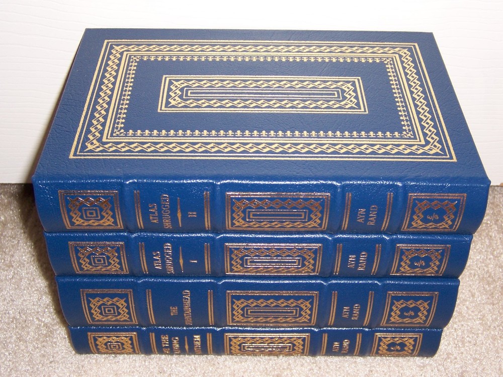 Heirloom Edition Easton Press NOVELS OF AYN RAND in 4 vols by Ayn Rand Blue leather binding with design on the front board exclusive illustrations BOUND IN GENUINE LEATHER Copyright by Easton Press Hubbed Spine, Bound in Premium Full Leather Distinctive Cover Design, Profusely Illustrated Moire Endleaves, Satin Ribbon Page Marker Accented in Real 22KT Gold, Gilt Page Edges Smyth-sewn Pages for Strength and Durability Long-lasting, High Quality Acid-neutral Paper LIST OF TITLES: a set in 4 leather-bound volumes: 1. Atlas Shrugged, Vol. I, illustrated by Frank Mayo 2. Atlas Shrugged, Vol. II, illustrated by Frank Mayo 3. The Fountainhead, illustrated by Victoria Vebell 4. We the Living and Anthem CONDITION DESCRIPTION: this set is in like new and unread condition: clean inside pages, tight binding, beautiful bright endpapers and satin ribbon page marker. SHIPPING / HANDLING: The books will be shipped via USPS media mail with delivery confirmation, special care will be taken during packing to ensure you receive the books as described.