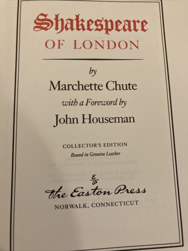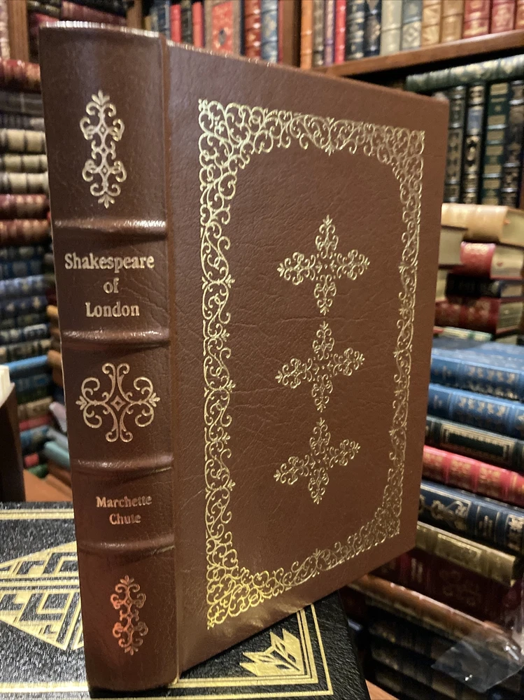 This Easton Press edition of *Shakespeare of London* is a stunning collector's piece. The burgundy leather, Smyth-sewn binding, and gold-gilded edges make it feel luxurious. Marchette Chute’s insightful biography paired with John Houseman’s foreword adds depth. The silk end leaves and satin bookmark are elegant touches. Despite a tiny gilt imperfection, it’s near flawless—a must-have for Shakespeare enthusiasts or fine book lovers. Holding it feels like owning a piece of literary history.