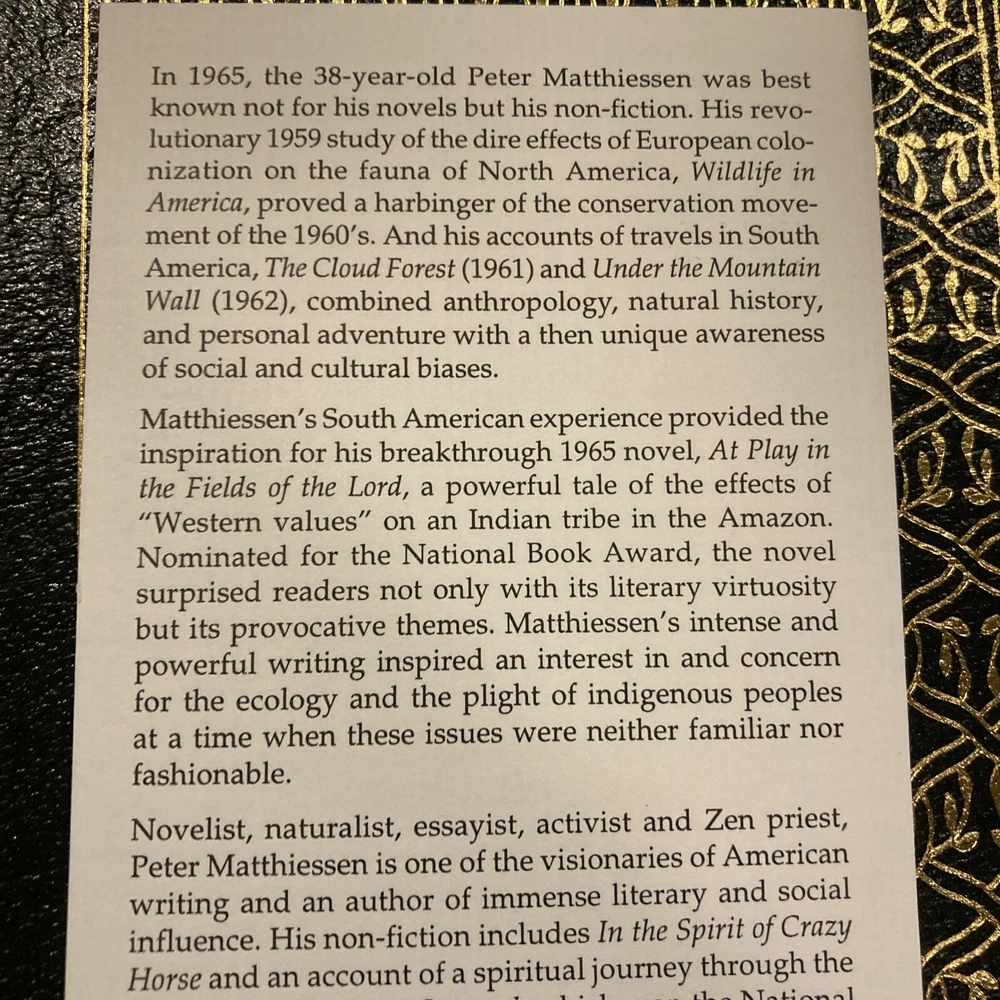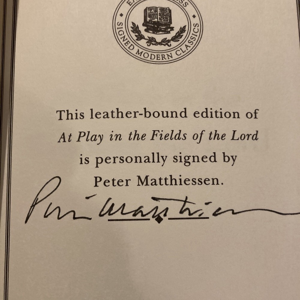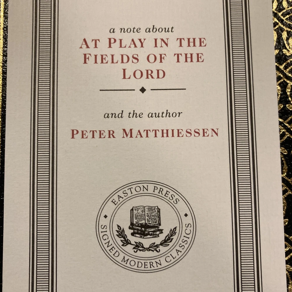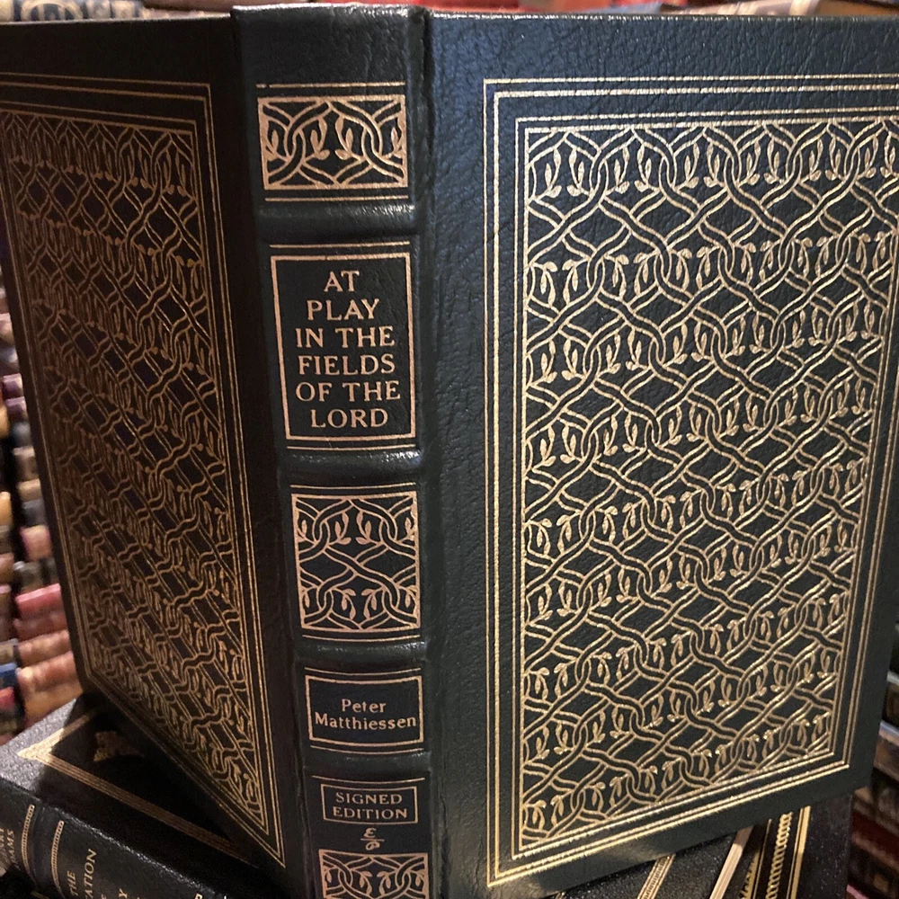 This Easton Press leather edition of *At Play in the Fields of the Lord* is a stunning collector’s piece. The hunter green leather binding, gold gilding, and silk end leaves make it feel luxurious. Having Peter Matthiessen’s personal signature and a certificate of authenticity adds incredible value. The craftsmanship is impeccable—Smyth-sewn binding ensures durability, and the near-fine condition means it’s been well cared for. A must-have for serious bibliophiles and fans of Matthiessen’s work. Truly a treasure!