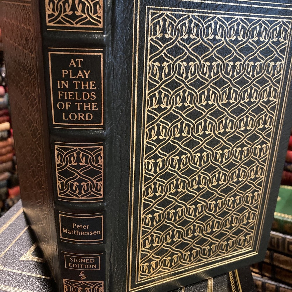 Easton Press leather edition of Peter Matthiessen's "At Play in the Fields of the Lord," a COLLECTOR'S edition, one of the FIRST EDITION SOCIETY series , PERSONALLY SIGNED BY PETER MATTHIESSEN, Certificate of Authenticity hich was signed on November 5, 2000, published in 2001. Bound in hunter green leather, the book has camel tan French moire silk end leaves, acid-free paper, Symth-sewn binding, a satin book marker, gold gilding on three edges---in near FINE condition---except for minor rub to top gilt. Pater Matthiessen, who lived from 1927-2014, was an American novelist, wilderness writer, Zen teacher, and CIA officer. He was a co-founder of the literary magazine, THE PARIS REVIEW. He was the only writer to have won the National Book Award in both nonfiction and fiction. "At Play in the Fields of the Lord" is a powerful tale of the effects of "Western Values" on the Indian tribe in the Amazon. Matthiessen 's intense and powerful writing inspired an interest in and concern for the ecology and the plight of indigenous peoples at a time when these issues were neither familiar nor fashionable. Novelist, naturalist, essayist, activist and Zen priest, Matthiessen is a vissionary. 373 pages. I offer combined shipping.