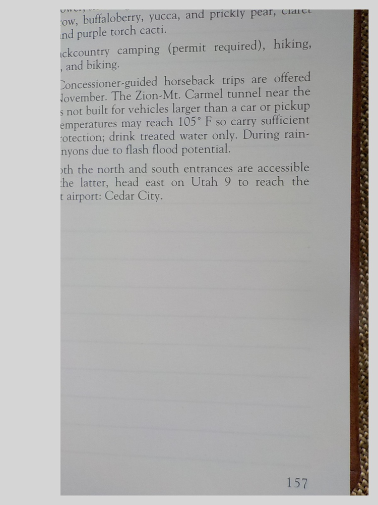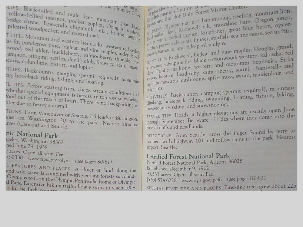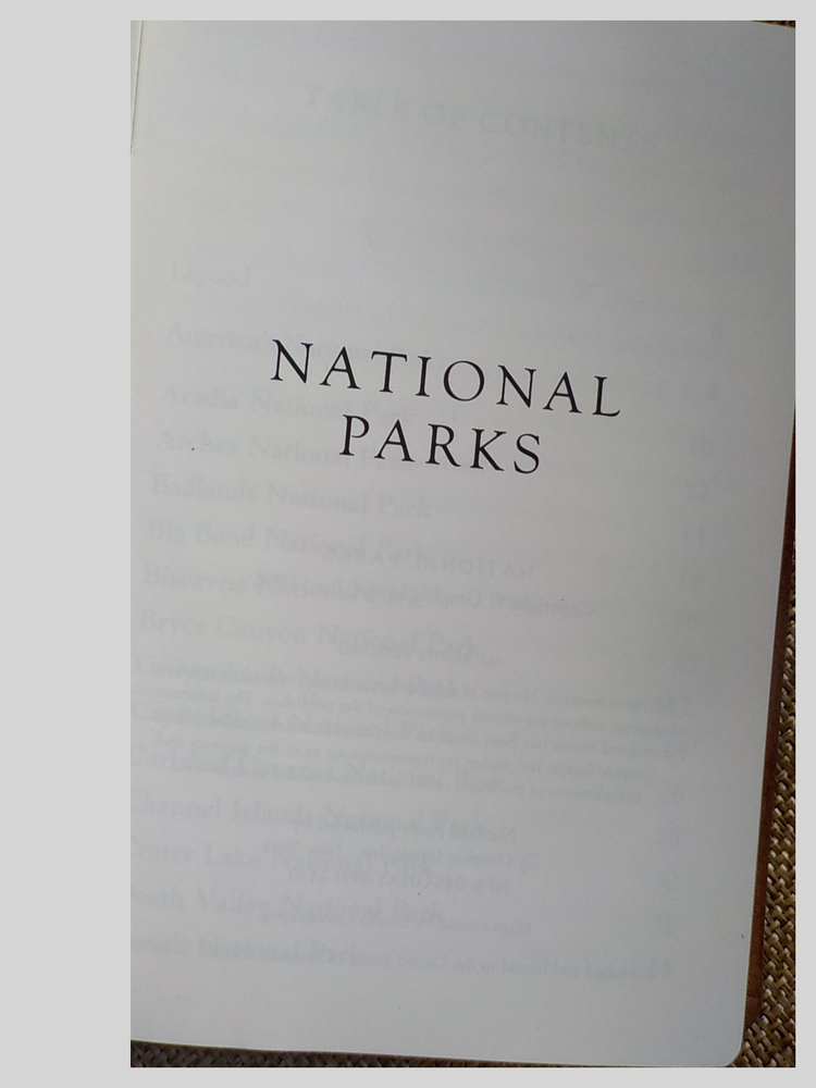This little leather-bound book showing the U.S. National Parks is small but had tons of info crammed into the 206 pages, including maps, histories, what to see, etc. There are even pages of phone numbers to airlines, hotels, rental cars, and numbers to call if your credit card is lost of stolen...everything one needs to know if you want to take a year off and travel. Except this book was published in 1998, when we needed maps to travel, stop at pay phones, etc. and some of these numbers or entities no longer exist, or if they do, they are easily found by asking SIRI and/or using your GPS. That kind of makes this little book a novelty, but there is a lot of information on the history of these parks that you still have to open a book and read (assuming you're already traveling). Some of these parks may be closed and some of these hotel/motel chains no longer exist. There are blank pages to record notes, and it even comes with a cute magnetized bookmark. It's small in size: 4.75 high, 3.25 +/-wide and 206 gilded pages. It's in perfect condition, sat is my bookcase for almost 30 years and never used.