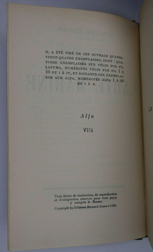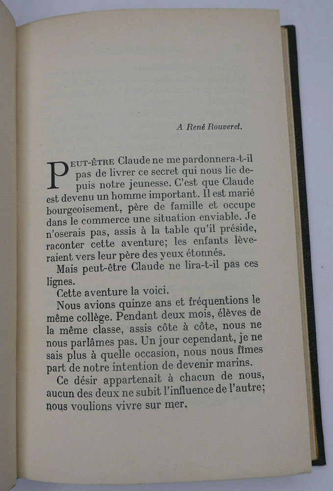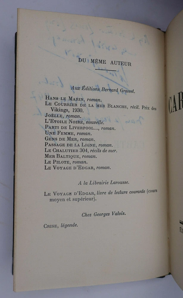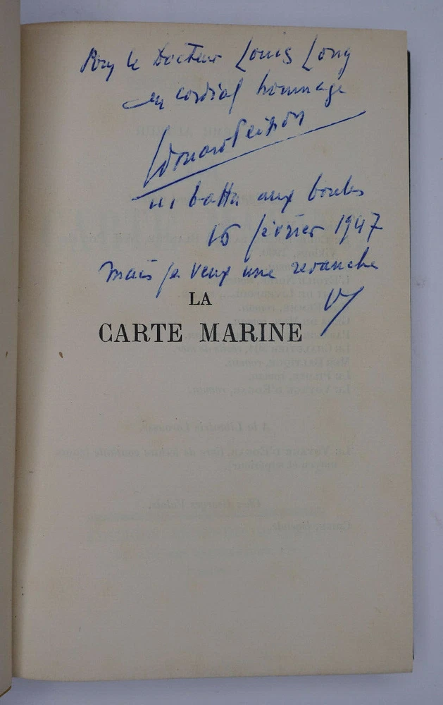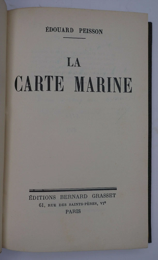 Edouard Peisson The Marine Map Original Edition Signed and Dedicated 1939 The description of this item has been automatically translated. If you have any questions, please feel free to contact us. Edouard PEISSON, The marine map. First edition signed and dedicated to Dr Louis LONG. At Bernard Grasset, Paris, 1939 . Dimensions: 18.5 x 12 cm. Green half morocco bound. Condition: Good general condition, fresh interior, rubbed and leathery binding. Edouard Peisson is a writer French , specialized in maritime novels, born in 1896 in Marseille and died in 1963 in Ventabren . He is one of the main French marine writers of the first half of the xx e century, and having had real prior professional maritime experience in the merchant and military navies, with Claude Farrère (real name Frédéric-Charles-Pierre-Edouard Bargone) and Bernard Poulailler (pen name: Bernard Frank).source Wikipedia. Packaging and carefully sent in a rigid, waterproof cardboard box. Returns accepted at the buyer's expense. Jérôme KAYSER Old books, autograph letters, old papers, engravings... A question? Do not hesitate to contact me on 07 82 69 98 28. Edouard PEISSON, The marine map. First edition signed and dedicated to Dr Louis LONG. Condition: Good general condition, fresh interior, rubbed and leathery binding. Edouard Peisson is a writer French, specialized in maritime novels, born in 1896 in Marseille and died in 1963 in Ventabren. He is one of the main French marine writers of the first half of the century, and having had real prior professional maritime experience in the merchant and military navies, with Claude Farrère (real name Frédéric-Charles-Pierre-Edouard Bargone) and Bernard Poulailler (pen name: Bernard Frank).source Wikipedia. Packaging and carefully sent in a rigid, waterproof cardboard box. Jérôme KAYSER Old books, autograph letters, old papers, engravings... A question? Do not hesitate to contact me on 07 82 69 98 Lieu de publication PARIS Auteur Edouard PEISSON Sujet Editions originales Époque 1900 à 1960 Reliure Cuir Reliure Relié Reliure Reliure d'art Nom de publication La carte maritime Date de publication 1939 Caractéristiques spéciales Édition de luxe Caractéristiques spéciales Édition limitée Caractéristiques spéciales Édition originale Objet modifié Non Langue Français