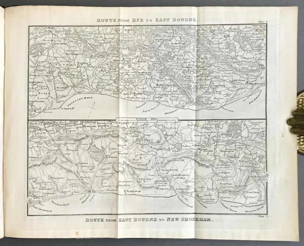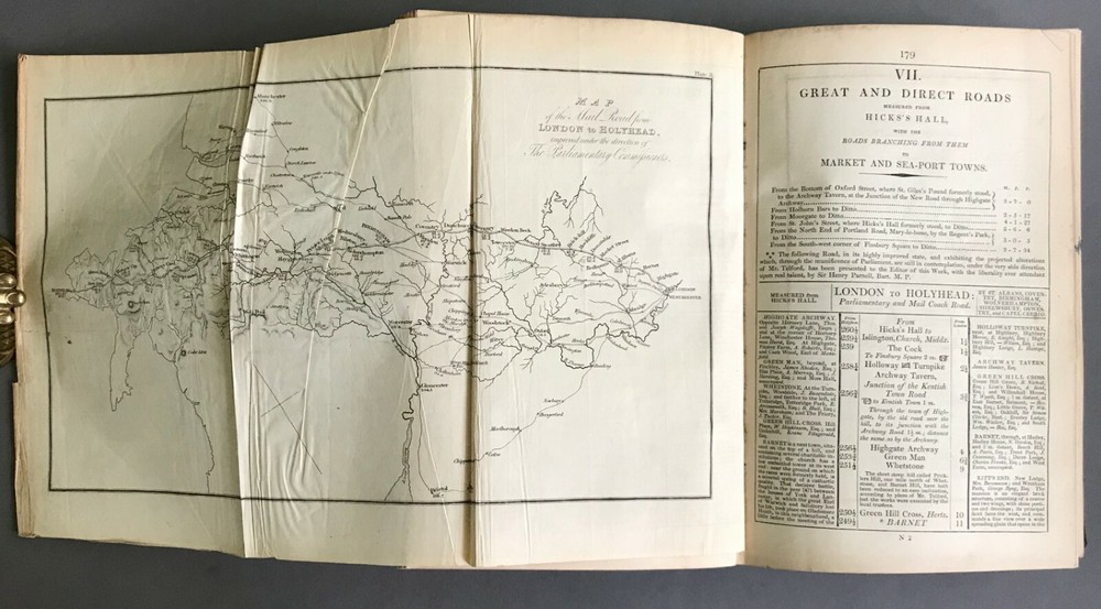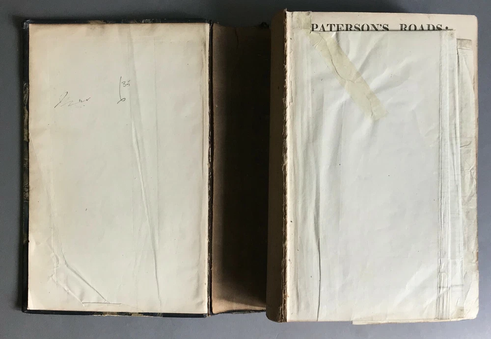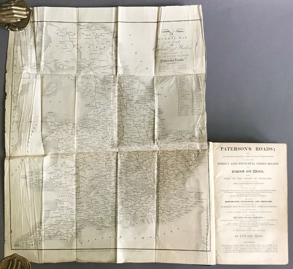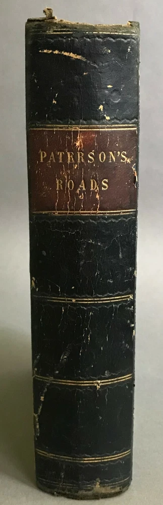 Edward Mogg Paterson’s Roads 18th Edition Longman, Rees, Orme, Brown 1832 Edward Mogg. Paterson’s Roads; Being an Entirely Original and Accurate Description of All the Direct and Principal Cross Roads in England and Wales, with Part of the Roads of Scotland. London: Longman, Rees, Orme, Brown, Green, and Longman, 1832. Eighteenth edition. 715pp + 44pp appendix. Illustrated with 10 maps, 9 folding, including frontispiece General Map of the Roads of England and Wales . Rebound in half leather over marbled paper boards, gilt stamped title label to spine. Extremities gently rubbed and edgeworn; front hinge broken, exposing spine; frontispiece is torn, with clear tape repair to verso; minor toning, occasional creasing and small tears to folding plates; binding is sound, interior clean and bright. Good or better. JJA-00746A Visit our eBay store for more great travel books! https://www.ebay.com/str/inkqnabula/Travels-Voyages-Places/_i.html?_storecat=24003226014