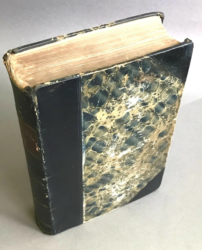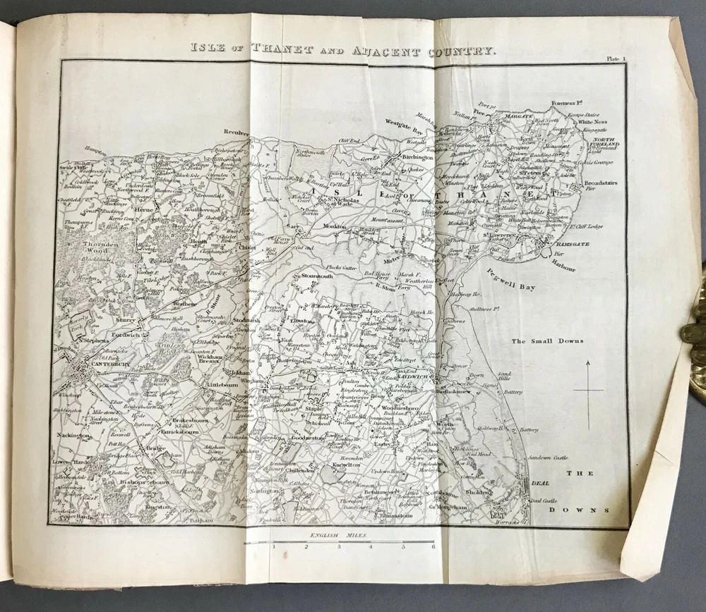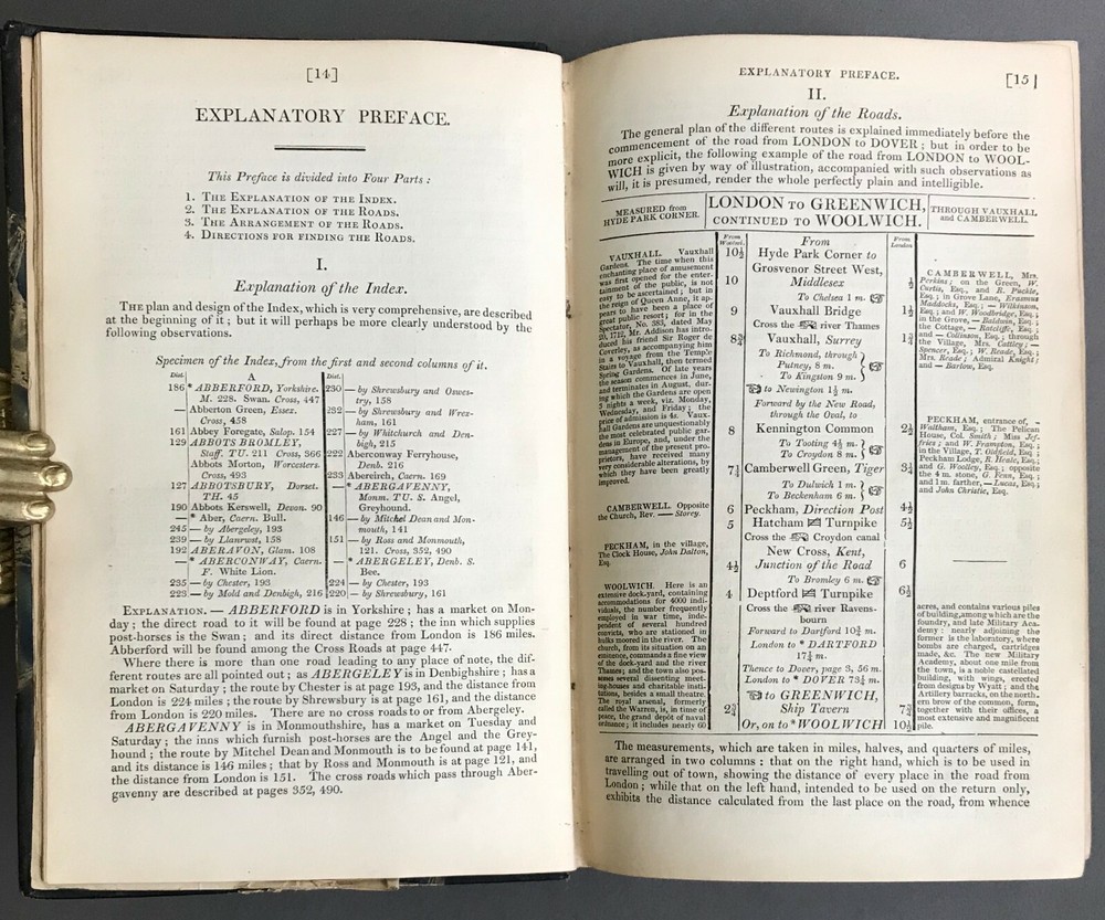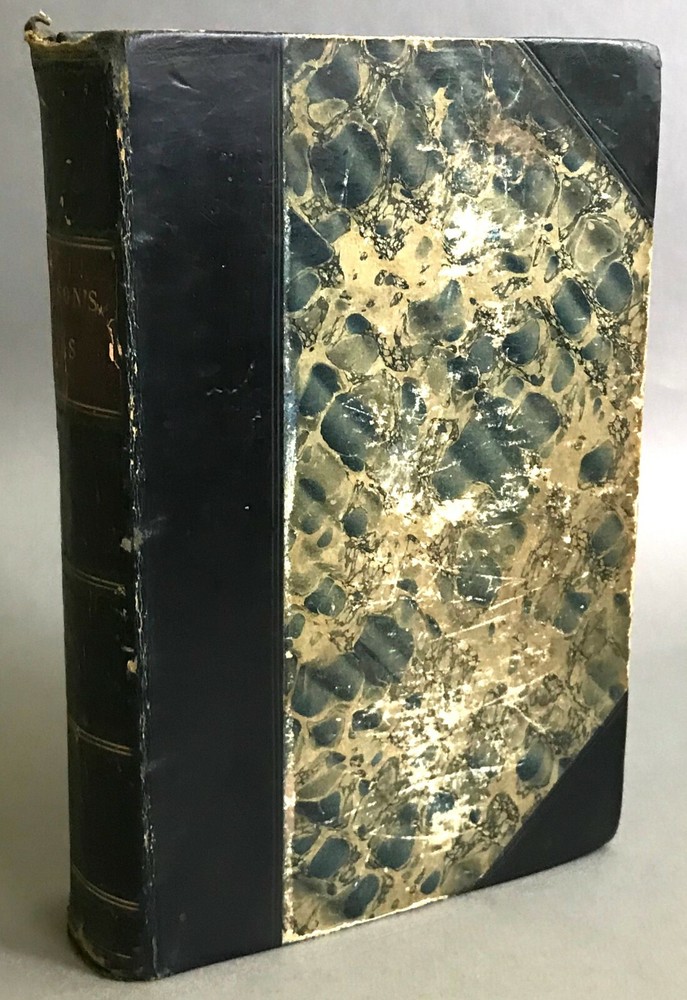 Edward Mogg Paterson’s Roads 18th Edition Longman, Rees, Orme, Brown 1832 Edward Mogg. Paterson’s Roads; Being an Entirely Original and Accurate Description of All the Direct and Principal Cross Roads in England and Wales, with Part of the Roads of Scotland. London: Longman, Rees, Orme, Brown, Green, and Longman, 1832. Eighteenth edition. 715pp + 44pp appendix. Illustrated with 10 maps, 9 folding, including frontispiece General Map of the Roads of England and Wales . Rebound in half leather over marbled paper boards, gilt stamped title label to spine. Extremities gently rubbed and edgeworn; front hinge broken, exposing spine; frontispiece is torn, with clear tape repair to verso; minor toning, occasional creasing and small tears to folding plates; binding is sound, interior clean and bright. Good or better. JJA-00746A Visit our eBay store for more great travel books! https://www.ebay.com/str/inkqnabula/Travels-Voyages-Places/_i.html?_storecat=24003226014