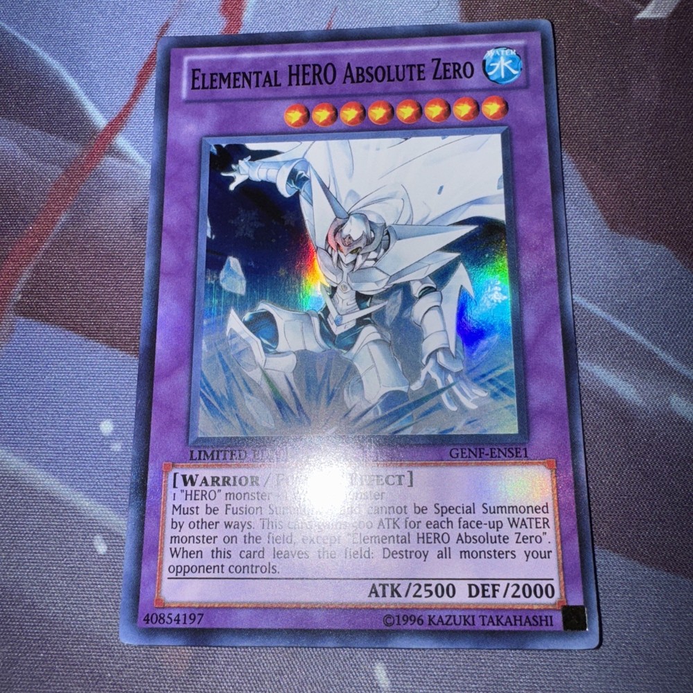 Dive into the heart of the Generation Force set with the Elemental HERO Absolute Zero, card number GENF-ENSE1. A must-have for any Yu-Gi-Oh! TCG enthusiast, this Super Rare card features the iconic Warrior-type creature with a formidable 2000 defense and an impressive 2500 attack. It's a card that can turn the tide of battle in your favor. This limited edition piece from Konami boasts the Effect and Fusion card types, allowing for versatile gameplay strategies. With its Water attribute, it adds a splash of strategic depth to your deck. The card is presented in English and remains ungraded, ensuring the potential for a prized addition to any collection.