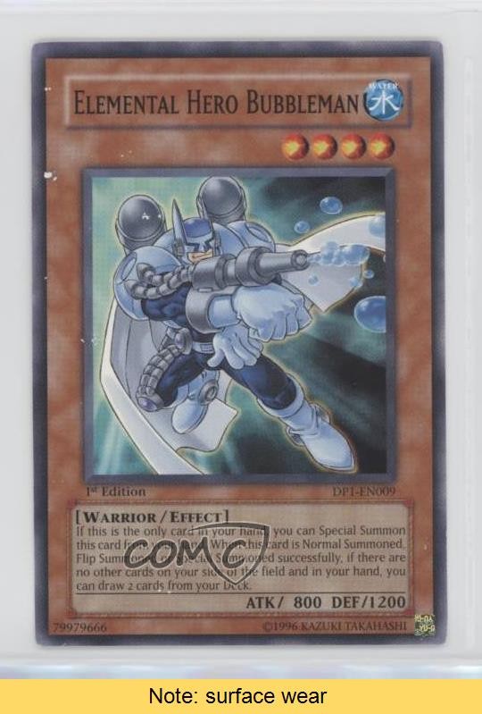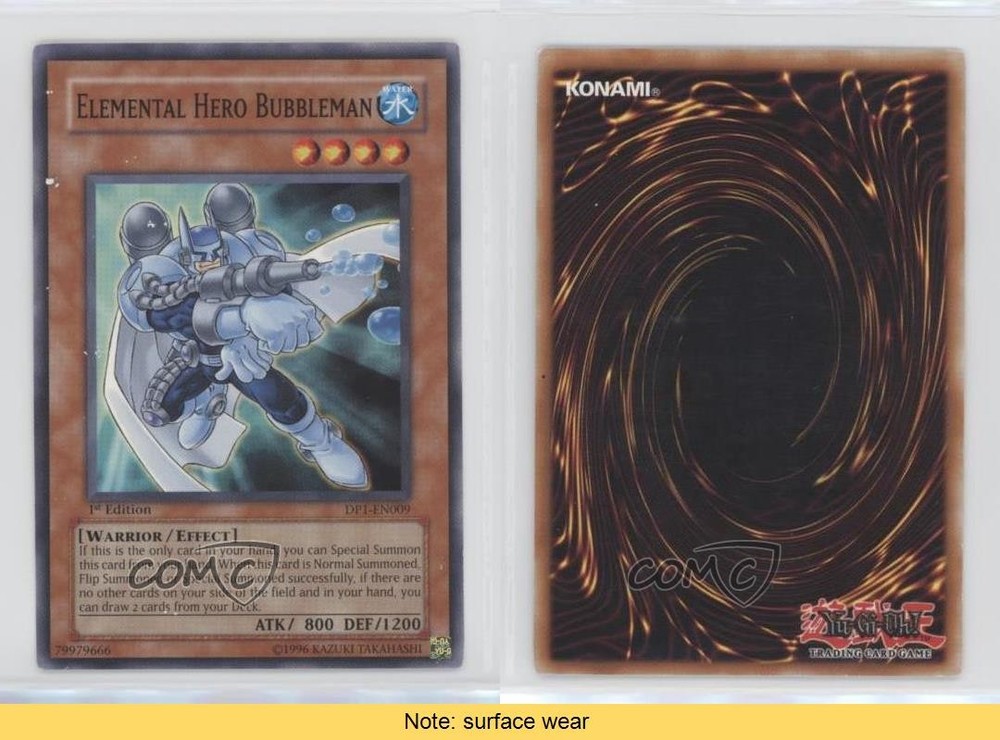 2006 Yu-Gi-Oh! - Duelist Pack: Jaden Yuki - [Base] - 1st Edition #DP1-EN009 Elemental HERO Bubbleman COMC Item: 109200423 CONDITION NOTE: surface wear - YuGiOh Card - Featuring Elemental HERO Bubbleman Search for more: 2006 Yu-Gi-Oh! - Duelist Pack: Jaden Yuki Search for more: 2006 Yu-Gi-Oh! - Duelist Pack: Jaden Yuki - [Base] - 1st Edition View all of our Listings Auctions Buy It Now About Us Located in the beautiful Pacific Northwest, COMC (Check Out My Cards) is the world's largest consignment service for trading card singles. More than 10,000 people have used our consignment service to list over 50 million trading cards. Find out how we can help you consign your items on eBay by contacting us through eBay messaging. COMC -- "The Safe & Easy Way to Buy & Sell" Raw Condition for Modern Cards Unless otherwise noted, raw modern cards are listed in Near Mint-Mint condition or better. A NM-MT card appears to be Mint at first glance, but upon closer inspection, may exhibit some of the following: minor print defects (e.g. roller marks, print line, dimple), minor scratches, slight edge wear, and slight corner wear. Centering is clearly visible in the images provided and does not factor into our condition assessment. Raw Condition for Vintage Cards Unless otherwise noted, raw vintage cards are listed in Excellent condition or better. An EX card may exhibit some of the following: minor rounding of corners, surface wear, print defects, light scratches, and slight edge wear/chipping. Centering is clearly visible in the images provided and does not factor into our condition assessment. Domestic Shipping Combined shipping for multiple items is available. To receive combined shipping, please ensure all desired items are in your eBay shopping cart before proceeding to checkout. eBay limits orders to 40 items per order. We automatically combine multiple orders placed on the same day. If you place multiple orders on the same day, please contact us to request a refund of applicable shipping costs. Signature confirmation may be required on invoices over $400. All cards are protected and shipped securely. International Shipping COMC offers eBay's International Shipping (EIS) for international orders under $2,500* (see country exceptions below). All duties and import fees are paid at checkout; in the rare event that there are additional import fees upon delivery, these are borne by the buyer. EIS packages route through a shipping hub in Erlanger, KY before shipping to their final destination. Please note that EIS does not allow for combined shipments. The shipping rates are determined by eBay and cannot be adjusted. *Maximum sale price exceptions: Colombia, Kuwait ($2,000); Taiwan ($1,539); Chile, Costa Rica, Guatemala, Honduras, Trinidad and Tobago ($1,000); Antigua and Barbuda, Aruba, Belize, Dominica, Grenada, Philippines, Saint Kitts and Nevis, Saint Lucia, Montserrat, Turks and Caicos Islands ($500); Dominican Republic, El Salvador ($200). Please request a shipping quote through eBay messaging for orders that exceed the maximum sale price supported by eBay's International Shipping. You will be responsible for all duties and import fees for international orders shipped outside the EIS. All cards are protected and shipped securely. Payment COMC does not accept offers on our cards through our eBay storefront. COMC utilizes eBay’s managed payments system. If you are experiencing difficulties making a payment, please contact eBay for assistance. Return Policy Returns are only accepted on the rare occasion the item is not as described. If you are making a return, please initiate the return process through eBay so a mailing label can be provided for you. Prior to listing, our expert team carefully assessed this item to represent it accurately. Please review the description and high-definition images prior to purchasing to ensure this item meets your satisfaction. We welcome you to contact us if you have further questions about this item. Trust and Integrity COMC carefully assesses each item consigned to us to prevent fraudulent items from entering the marketplace. If you believe an item offered on COMC may be fraudulent, please contact us with details so we can investigate the issue. Items we determine are outside our supported items policy may be removed. Last Modified: 7/8/2025 3:29:41 AM PDT