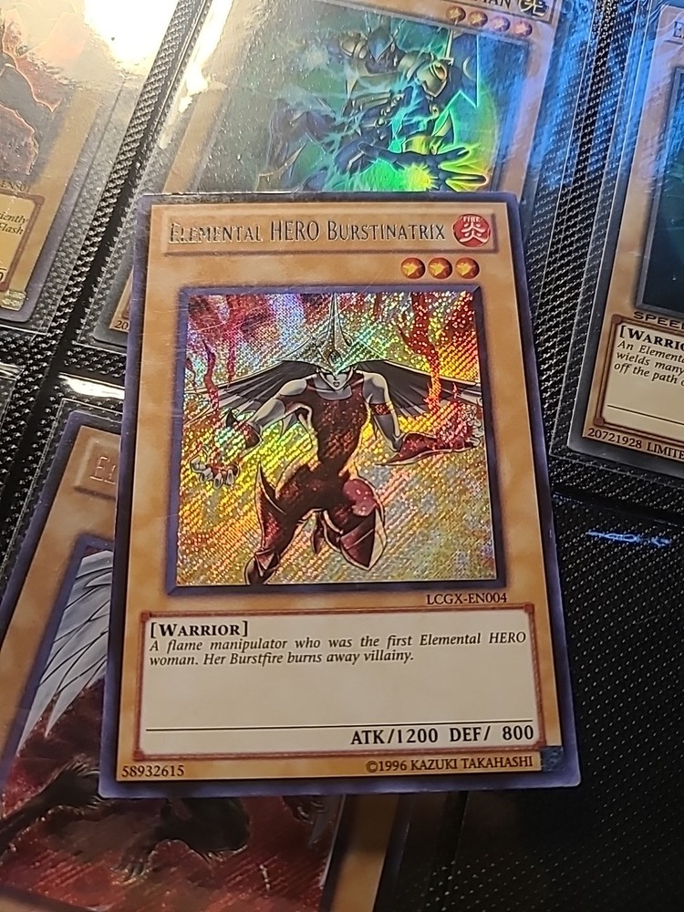 The Elemental HERO Burstinatrix (Alternate Art) card is a Fire type Secret Rare card from the Yu-Gi-Oh! TCG, part of the Legendary Collection 2: The Duel Academy Years set. Manufactured by Konami, thi...