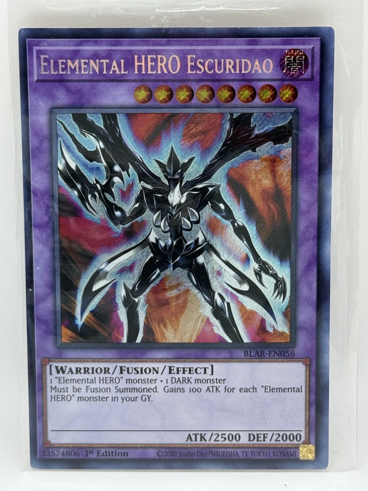 This is an amazing card for Yu-Gi-Oh! fans who love collecting rare and valuable items. The Elemental HERO Escuridao BLAR-EN056 1st Edition Secret Rare card is a must-have for any serious collector. With its Japanese card size and English language, this card is perfect for adding to your collection or for use in gameplay. The card features the iconic Konami manufacturer logo and is from the Yu-Gi-Oh! TCG franchise. It is suitable for ages 8 and up and is in near-mint condition. Whether you're a seasoned collector or just starting out, this card is an excellent addition to any collection.