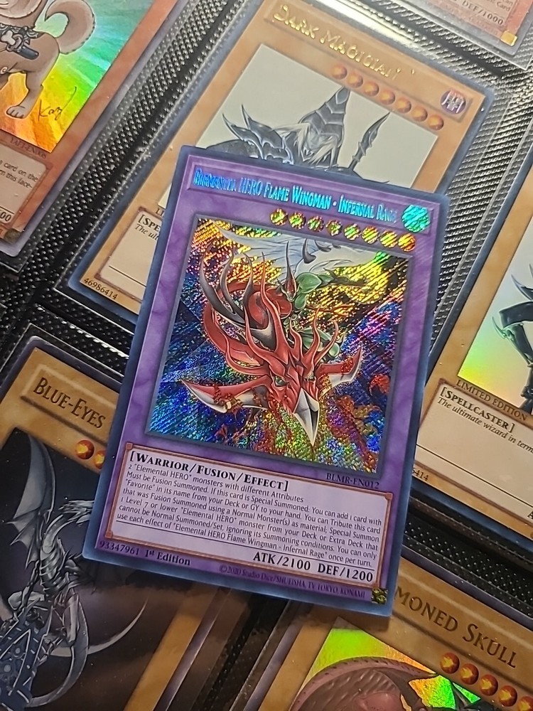 Get ready to add the Elemental HERO Flame Wingman - Infernal Rage Secret Rare BLMR-EN012 card to your Yu-Gi-Oh! TCG collection. This Japanese-sized card is made of durable card stock material and features a stunning foil finish. The card belongs to the Photon Hypernova set and is a 1st edition. This fusion card is perfect for Dragon-type creatures and is a must-have for any Yu-Gi-Oh! fan. The card is in English language and manufactured by Konami. Don't miss out on the chance to own this rare and valuable card.