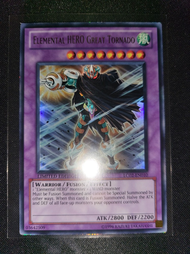 The Elemental HERO Great Tornado LC02-EN010 card from the Legendary Collection 2: The Duel Academy set is an ultra rare, English-language card in the Yu-Gi-Oh! TCG. This card features a wind attribute, a warrior creature type, and a defense/toughness of 2200 with an attack/power of 2800. Manufactured by Konami, it is a limited-edition effect fusion card that is highly sought after by collectors and players alike.