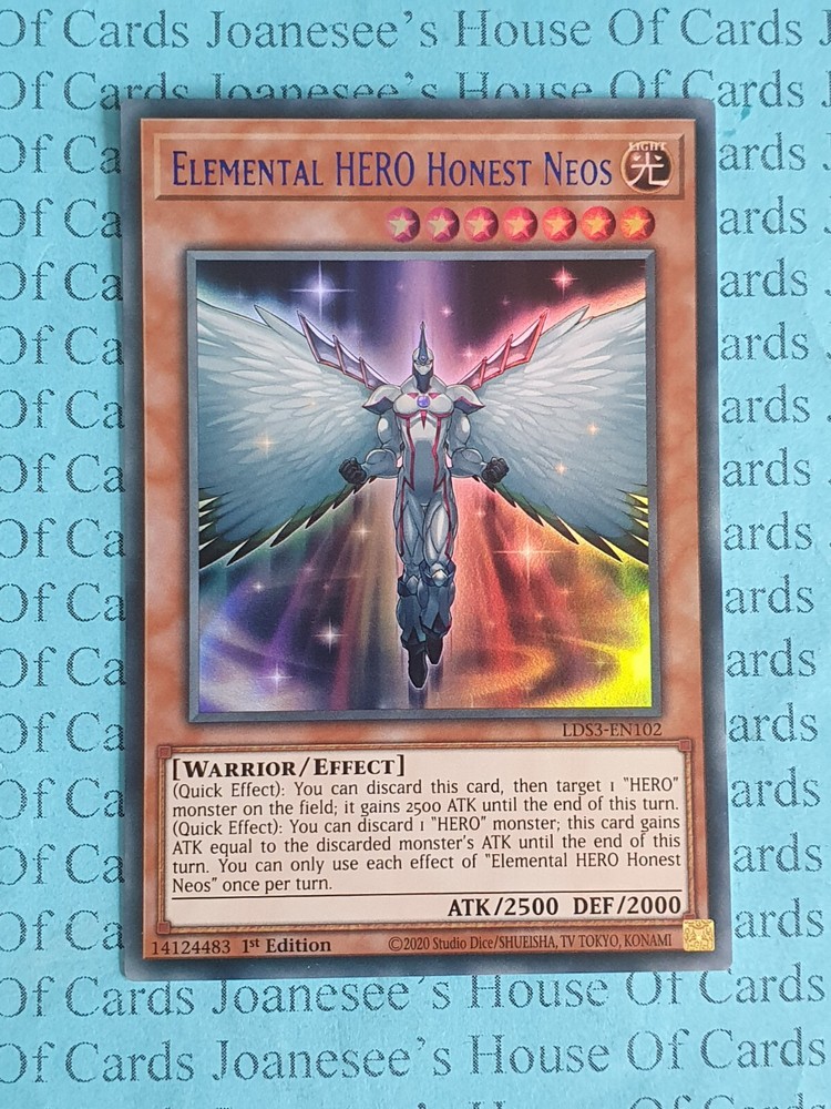 This is the Blue Ultra Rare Holo Light Warrior Elemental HERO Honest Neos 7 Stars ATK/2500 DEF/2000 Card text: (Quick Effect): You can discard this card, then target 1 "HERO" monster on the field; it gains 2500 ATK until the end of this turn. (Quick Effect): You can discard 1 "HERO" monster; this card gains ATK equal to the discarded monster's ATK until the end of this turn. You can only use each effect of "Elemental HERO Honest Neos" once per turn. LDS3-EN102 1st Edition English Mint/NMint Condition Totally Original Konami (or your money back!) I will deliver in safe packaging to keep it in perfect condition. Ideal for players and collectors alike. Check out my other items! I will combine postage costs for multiple purchases. Sign up for my email newsletters by adding my eBay Shop to your favourites