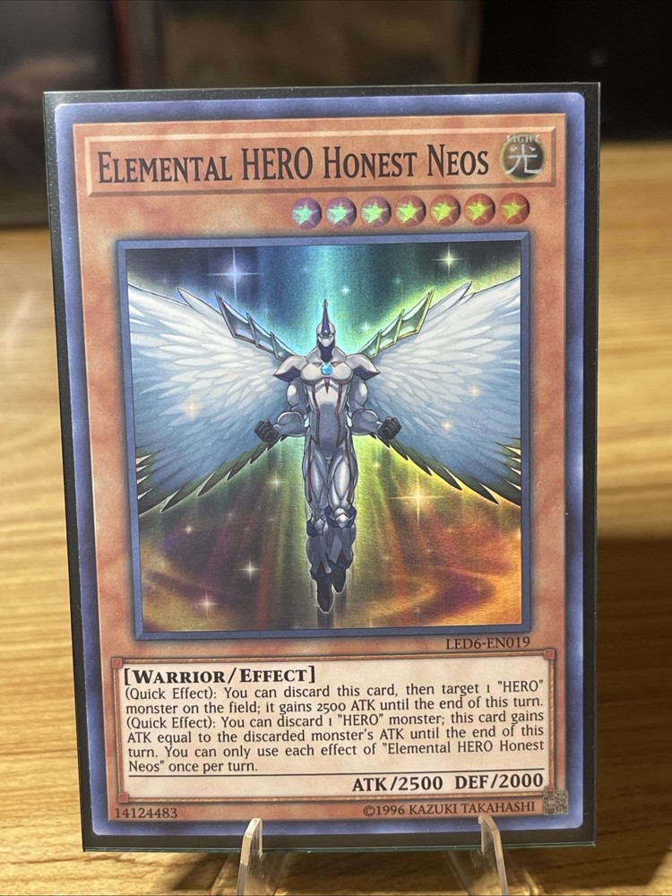 Elemental HERO Honest Neos LED6-EN019 from the Legendary Duelists: Magical Hero set is a Super Rare card with an attack power of 2500 and a defense toughness of 2000. It has the Effect type and the Warrior monster type. The card is in the English language and has the Unlimited Edition feature. The manufacturer is Konami.