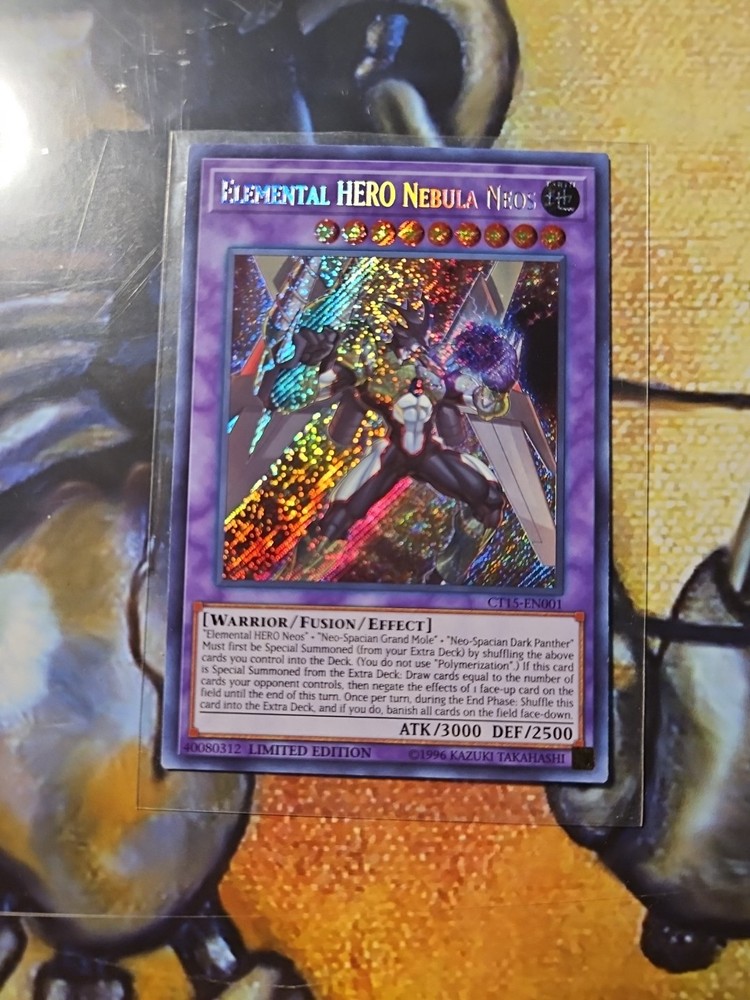 The Elemental HERO Nebula Neos CT15-EN001 card is a Secret Rare limited edition card from the 2018 Mega-Tins set of the Yu-Gi-Oh! TCG. Manufactured by Konami, this Fusion Effect Monster card belongs to the Warrior type with impressive stats of 3000 Attack and 2500 Defense. The card is in English language and features the Earth attribute, making it a valuable addition to any Yu-Gi-Oh! card collection.