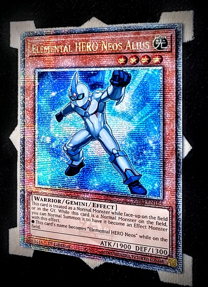 Card Name : Elemental HERO Neos Alius Rarity : Quarter Century Secret Rare Set code : RA03-EN184 Print Run : 1st Edition Region of Print : Europe Condition : Near mint or better Postage : Will be sent toploaded with a hard back envelope. Please note that listed prices are per card. If you would like to purchase a playset, please select a quantity of 3.