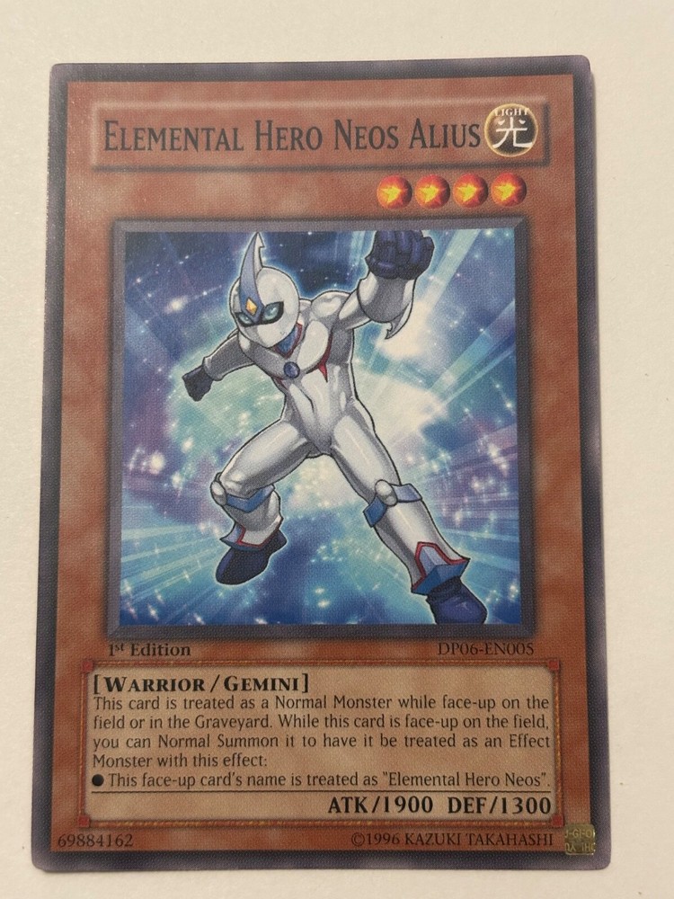 The "Elemental HERO Neos Alius" card is a Common/Short Print card from the Structure Deck: HERO Strike set in the Yu-Gi-Oh! TCG. It is a Warrior-type creature with 1900 Attack and 1300 Defense, representing the Light attribute. This 1st Edition card is in English and features the Gemini and Effect card types, with a Standard size and Regular finish. It is manufactured by Konami and carries the card number SDHS-EN008.