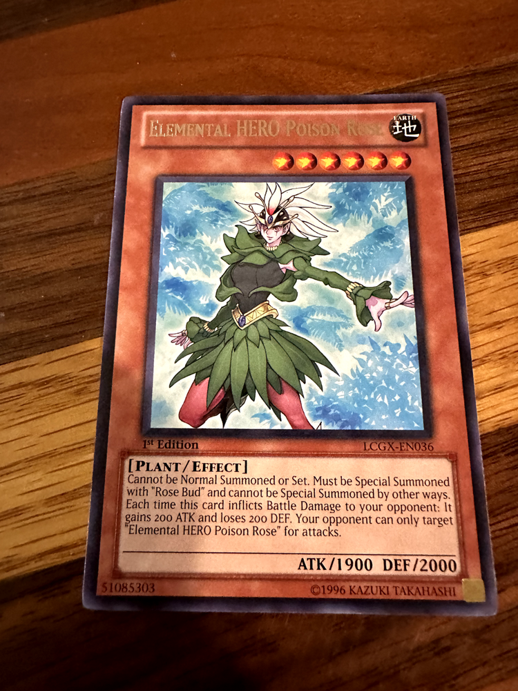 Hello! You are buying one Elemental HERO Poison LCGX-EN036 1st Edition Rare in lightly played condition. Reason for lightly played condition is minor general play/scratchwear, mostly on back. See photos for details! As a thank you for buying from me, I will throw in two free Yugioh commons! Thank you so much for looking, have a great day! If there is ever an issue, please let me know so I can do whatever I can to resolve it! Please check out my other items! I have many more single cards!