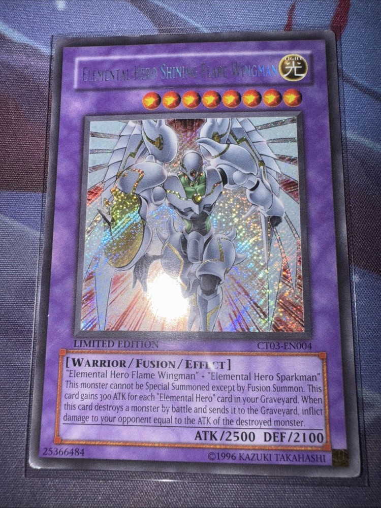 Dive into the realm of duelists with the legendary Elemental HERO Shining Flare Wingman, a Secret Rare gem from the 2006 Collector's Tin. As a pivotal card in the Yu-Gi-Oh! TCG, it boasts an impressive 2500 attack power and 2100 defense toughness, ready to take on any challenge in your next battle. This English version card, numbered CT03-EN004, is a must-have for collectors and players alike, featuring the iconic Warrior creature/monster type. Proudly produced by Konami, this limited edition card is a shining effect fusion card that adds not only strategic value but also a touch of rarity to your collection.