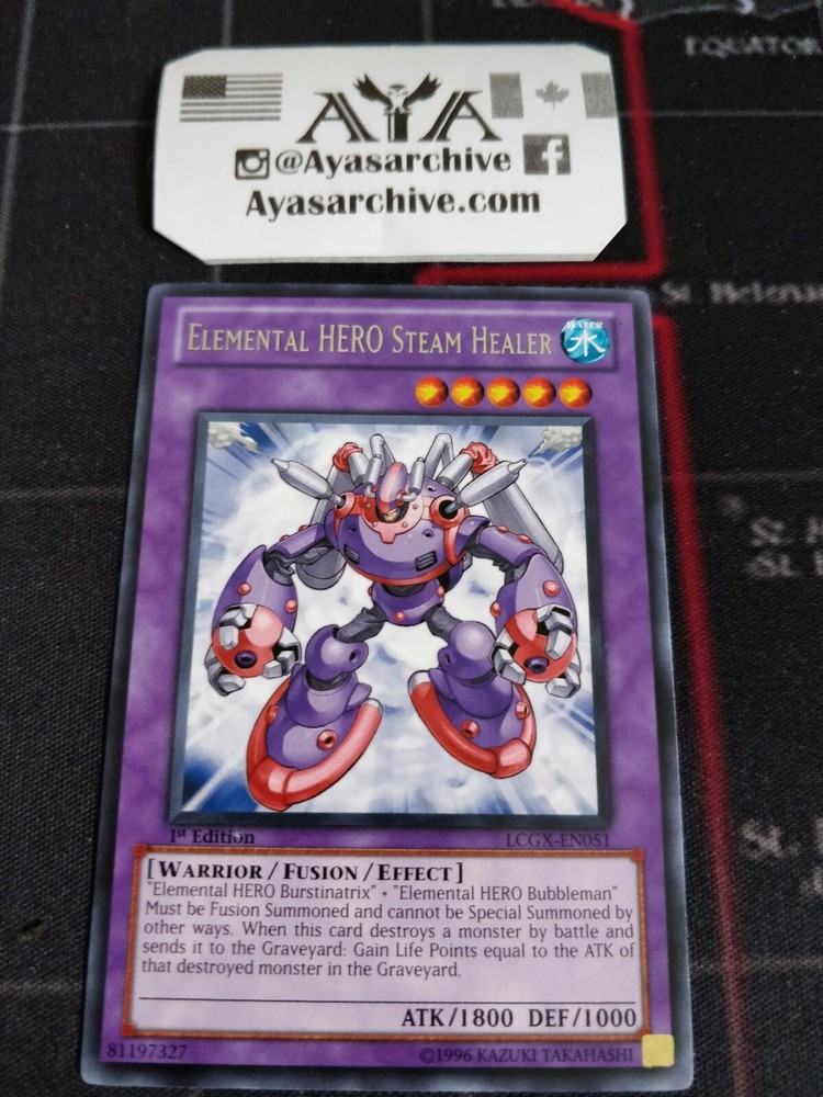You will receive: 1 x Elemental HERO Steam Healer - LCGX-EN051 - Rare - 1st Edition Condition: Near Mint, English HUGE INVENTORY ON OUR WEBSITE . PLEASE CHECK OUT OUR STORE FRONT FOR MORE INFORMATION. ♠ We have more copies on our website & a large collection of cards (Discounts/Coupons, Rewards and more) SET GUIDE : ALL CARDS ARE = 1ST ED/NM UNLESS DENOTED UNL= UNLIMITED LTD= LIMITED C= COMMON R= RARE SR= SUPER UR= ULTRA SEC= SECRET ULT=ULTIMATE Follow us on our Instagram page & e B A Y Store @ ayasarchive for your daily YGO Eye Candy from our collection. Feedback Feedback is Given , once Feedback is Left . ;) For flash deals, follow our store, and subscribe to our email list. New cards every week. Shipping Shipping within Canada: (3-8 business days) Shipping from Canada to the U S A : (7-15 business days) We treat our cards and shipping process with the utmost importance, every delivery is recorded in our database. Every transaction is monitored. For future reference, if any disputes were to arise, documentation will be provided. These cards are : Shipped within 1 Business day. 100% authentic, tournament legal cards! Near Mint Condition, unless specified. Shipped sleeved and in a toploader! Delivery Delays: Suggested delivery range from eBay is not always accurate. Delays can be caused by many factors which are out of our control ie: Weather, customs, government disruption, strikes ...etc We ship our cards out within 1 business day by dropping them off at the Canadian post office. Thank you for understanding. Guide Mint ( NM/M ): No apparent imperfections; possible light scratches on surface. Has crisp corners, and unblemished edges. Near Mint ( NM) MAY contain very minor imperfection, possible light scratches on surface, 1-3 light blemish on edges of card, if you need please inquire for more photos Near Mint ( NM/VLP) MAY contain some minor imperfection, possible light scratches on surface, light blemish on edges of card Light Play (LP): Light edgewear or corner wear and/or multiple small bends/creases/dents. Moderate Play (MP): Very visible condition issues visible at a casual glance; border wear, corner wear, scratching or scuffing, creases or whitening, minor dirt buildup, water damage, etc. Heavy Play ( HP ): Major/multiple bends, creases, and/or dents throughout card, heavy border wear, tearing. Damaged (DMG) : The card is damaged, please refer to the picture in the listing for the location of the damage. (Even when sleeved, These cards cannot be used in official tournaments .) CANT FIND WHAT YOU'RE LOOKING FOR? Our website has a large selection, included many unlisted cards. If you want it, we may have it. Private message us or DM us on instagram. Much love for choosing AYATCG. Be sure to check out our store for more CARDS & SLEEVES, ayasarchive (.) com