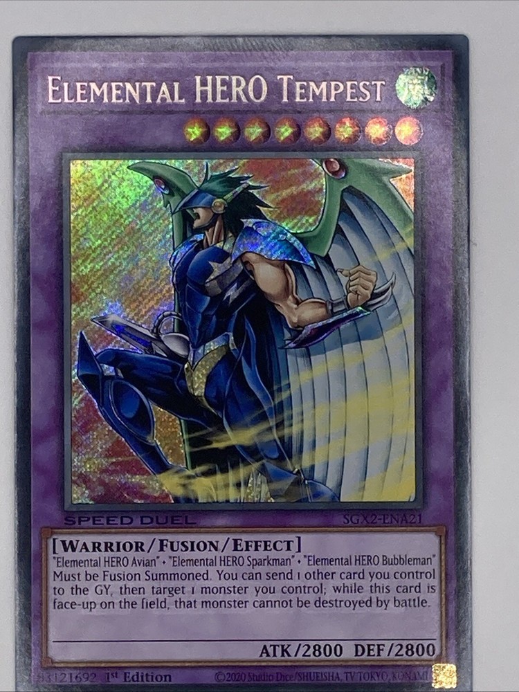 Unleash the power of the elements with the 'Elemental HERO Tempest (Secret Rare) SGX2-ENA21' from the Speed Duel GX: Midterm Paradox set. This card boasts an impressive 2800 attack and defense power, making it a formidable addition to your Yu-Gi-Oh! TCG arsenal. As a 1st Edition Secret Rare, it's a must-have for collectors and competitive players alike. Crafted for those who favor the strategic use of wind attributes, this Warrior-type card fits seamlessly into a variety of decks. Produced by Konami and designed for players aged 6 and up, the 'Elemental HERO Tempest' is a Fusion and Effect-type card that comes in English language. Its unique card number ensures it stands out in your collection. Thank you for viewing our Yu-Gi-Oh cards on eBay! This card has come straight from the booster pack straight to a penny sleeve. If you have any questions or issues, please do not hesitate to reach out to us! We will do everything we can to assist you! Thank You!