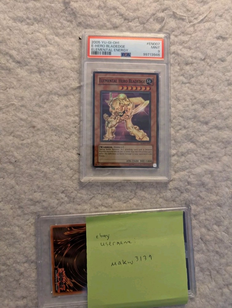 The product is an Elemental Hero Bladedge trading card from the Elemental Energy set of the Yu-Gi-Oh! TCG. This Super Rare card is in English and has been professionally graded by PSA as a 9. With attributes of Earth element, Warrior monster type, 2600 Attack and 2200 Defense, this card holds a high grade of 275022 and a certification number of 99713946. Manufactured by Konami, the card is part of the Normal card type and bears the card number EEN-EN007.