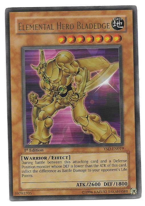 This Elemental Hero Bladedge card is out of YuGiOh set Yugioh Stucture Deck. This card is in nrmt condition. Card number #YSD EN019, Ultra, and 1st Edition. This card will be shipped in a semi-rigid in an envelope. Free combined shipping in the United States on the Same Day Not Over a Week Period. Payments must be received within 6 day. No Foreign Orders!