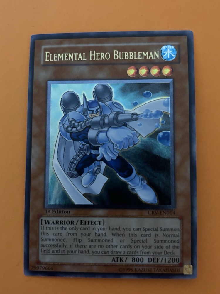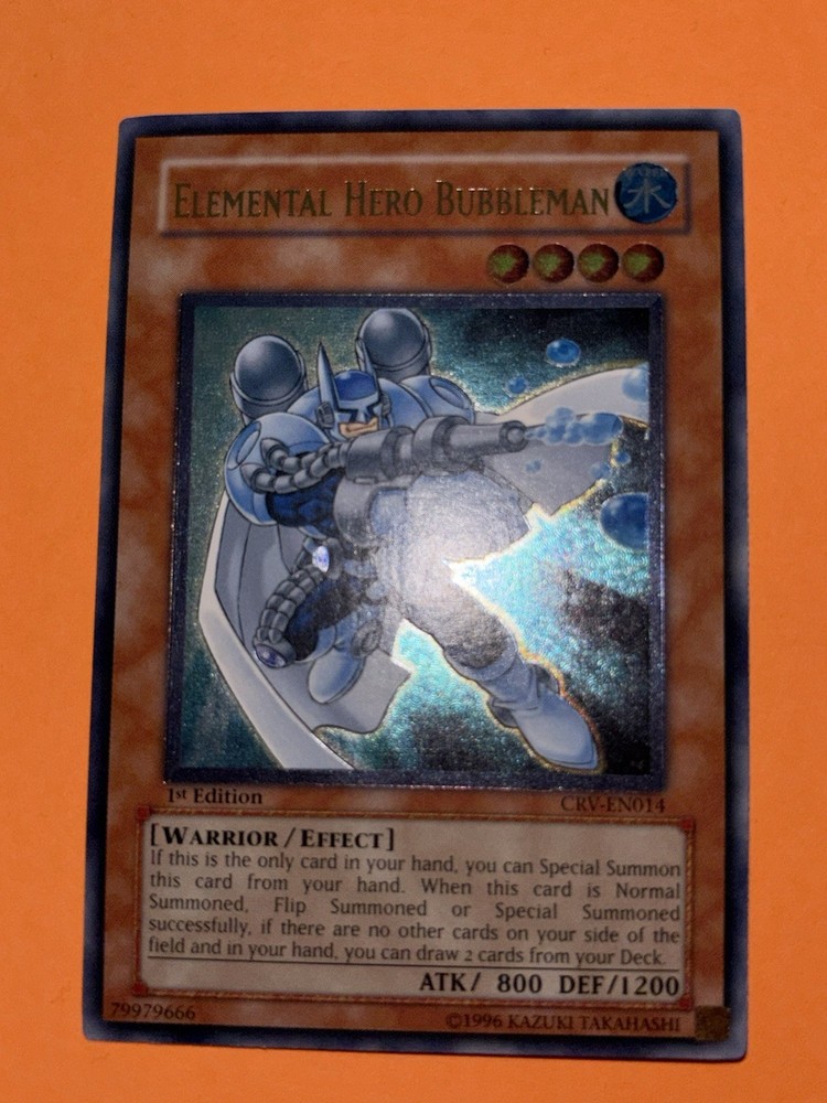 You are bidding on an Elemental Hero Bubbleman - CRV-EN014 - Ultimate Rare - 1st Edition NM Near Mint card. Bid with confidence. I have 100% feedback. Make an offer. I will not reject any offers, only accept them or counter them. And I respond quickly to offers! International buyers are welcome. Be sure to check out my other auctions. Happy Bidding!