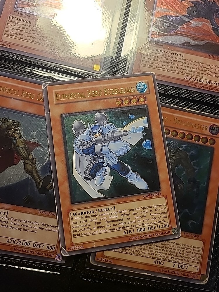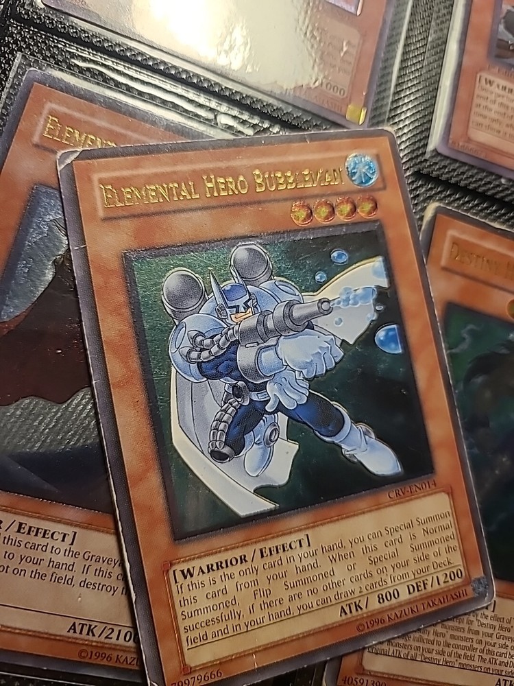 This Elemental HERO Bubbleman card from Yu-Gi-Oh! is a highly sought-after collectible for any CCG fan. It features a beautiful Ultimate Rare design and is a 1st Edition card from the CRV Cybernetic Revolution set. The card has been moderately played and is in very good condition. The Bubbleman card is a valuable addition to any card collection, especially for those looking to complete their Yu-Gi-Oh! sets. Please refer to the provided aspects for more details on the card's rarity and game set. Don't miss your chance to own this amazing card!