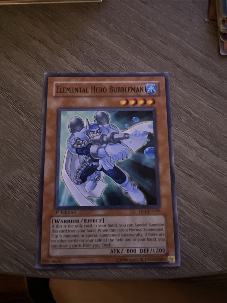 The Elemental Hero Bubbleman card is a rare and sought-after collectible in the Yu-Gi-Oh! TCG. This water attribute warrior card, with a high defense of 1200 and attack power of 800, is from the Cybernetic Revolution set and is a 1st Edition release. Manufactured by Konami, this English language card is a valuable addition to any card collection. With its ultimate rarity and unique features, this card is a prized possession for fans and collectors of Yu-Gi-Oh! cards.