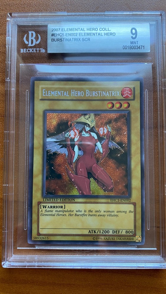 Dive into the world of Yu-Gi-Oh! TCG with the Elemental Hero Burstinatrix, a prized addition from the Elemental Hero Collection 1. As a Secret Rare card with a Holo finish, it stands out in any collection. The card showcases the fiery Warrior-type character in stunning detail, a testament to the artistry of 5ban Graphics, and is a must-have for both serious collectors and fans of the series. This English language card, manufactured by Konami in 2007, is a Normal-type collectible that has been graded BGS 9, indicating its impressive preservation. The Elemental Hero Burstinatrix, card number EHC1-EN002, is a limited edition piece that has not been autographed, keeping its focus purely on its striking artwork and rarity within the game.