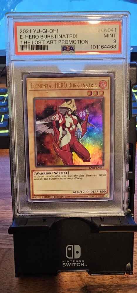 The "Elemental Hero Burstinatrix" card is a Japanese-sized Ultra Rare Yu-Gi-Oh! TCG collectible from The Lost Art Promotion set, featuring an Alternative Art design. Manufactured by Konami in 2021 on card stock material with a foil finish, this Warrior-type Monster card has an Attack/Power of 1200 and Defense/Toughness of 800. It is part of the Attribute/MTG: Color Fire and is language is English. The card number is LART-EN041 and it is not autographed.