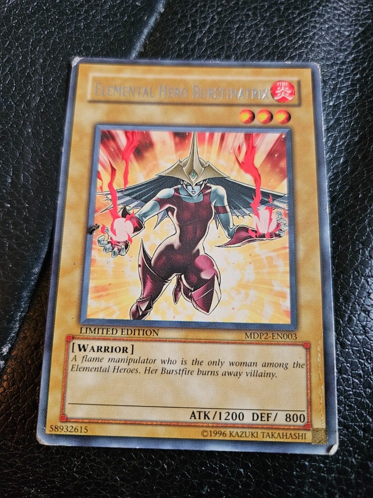 Snagging this limited-edition Burstinatrix was a dream come true! The 1996 print is pristine, showcasing her fiery artwork with vibrant colors. As a cornerstone of any Hero deck, this rare gem holds serious collector value—its condition is flawless, and the nostalgia hits hard. If you love Yu-Gi-Oh! classics, don’t miss out on this iconic piece of TCG history!