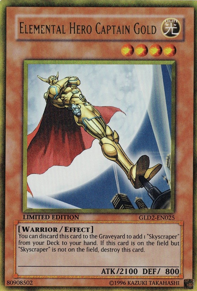 Elemental Hero Captain Gold - Gold Rare - GLD2-EN025 - ( limited Edition ) Card Desription: You can discard this card to the Graveyard; add 1 "Skyscraper" from your Deck to your hand. If "Skyscraper" is not face-up on the field, destroy this card.
