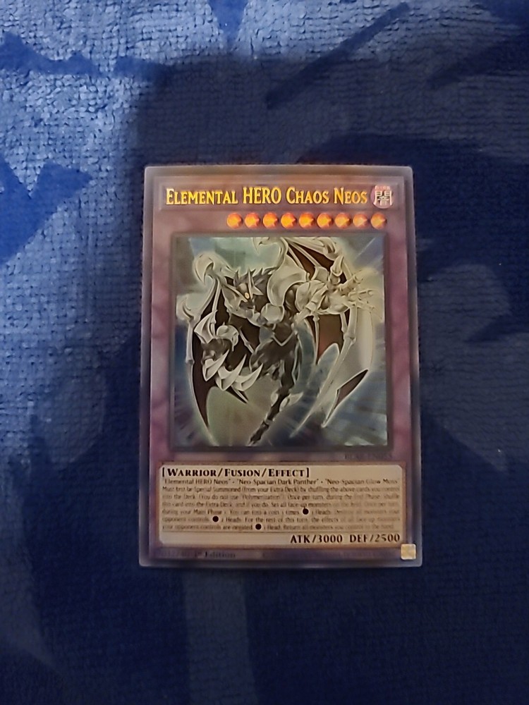 The “Elemental Hero Chaos Neos BLAR-EN055” card is an Ultra Rare collectible card from the Battles of Legend: Armageddon set in the Yu-Gi-Oh! TCG. This 1 st Edition card features a Dark attribute Warrior monster with 3000 Attack and 2500 Defense. Manufactured by Konami, it is in English language and not autographed. This powerful card is a sought-after addition for collectors and players alike in the world of collectible card games.
