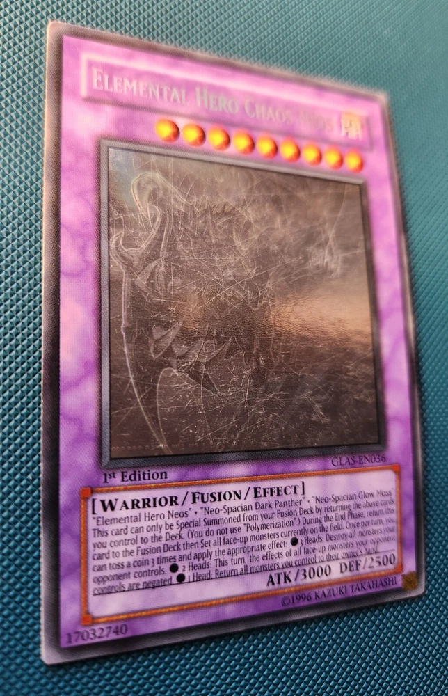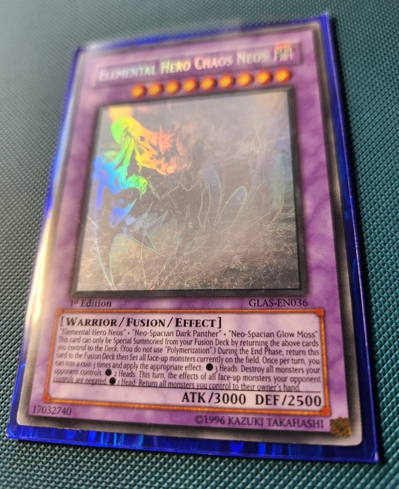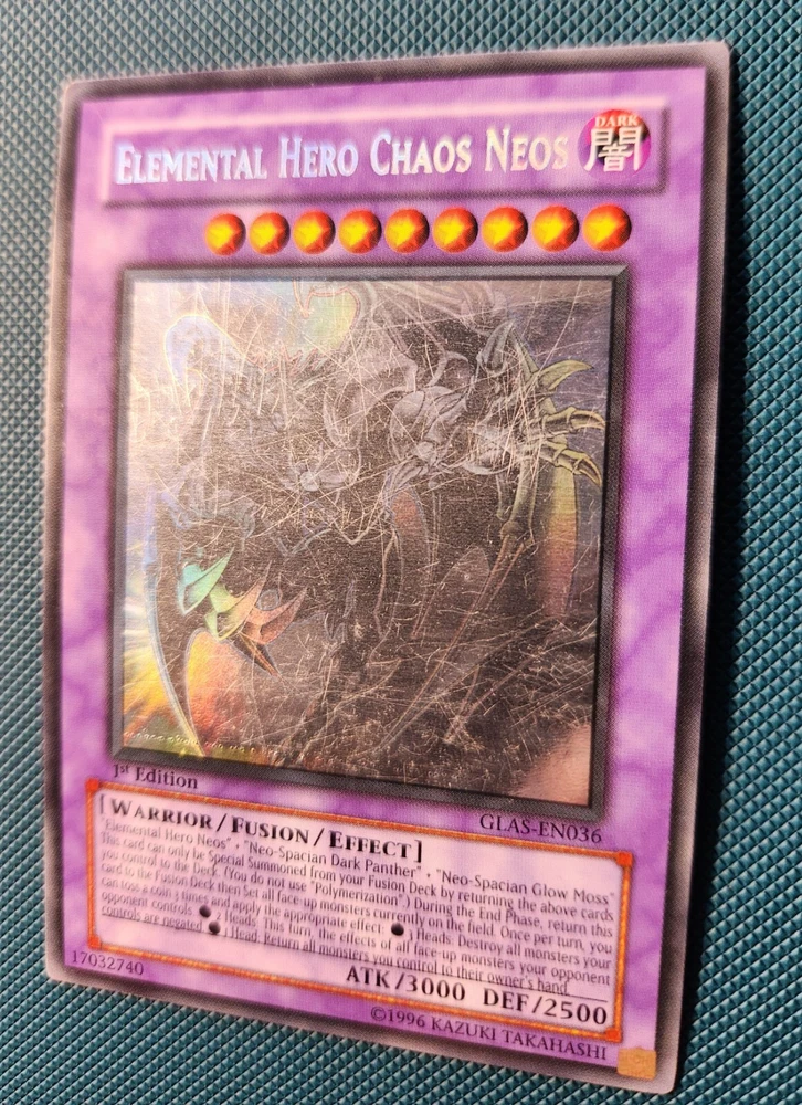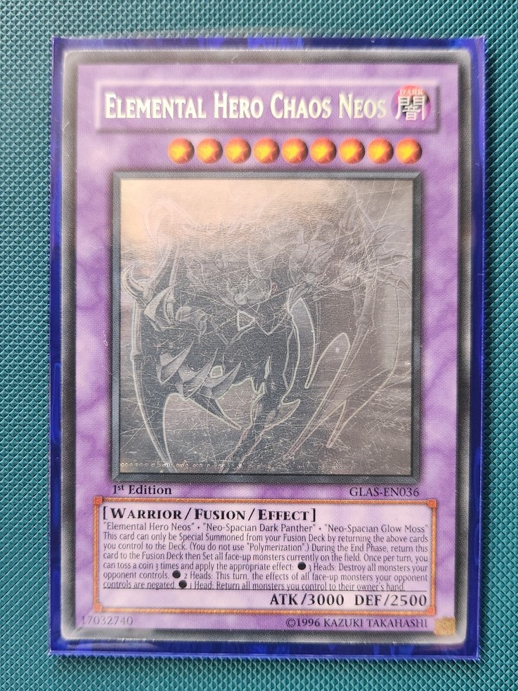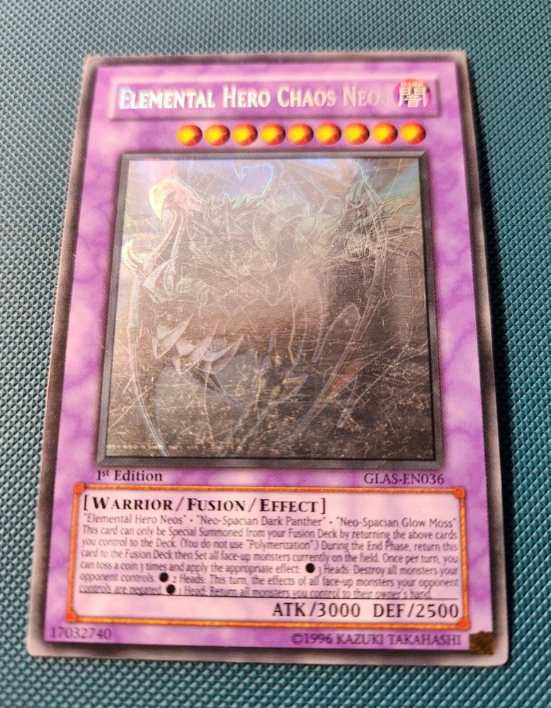 This is a 1st Edition, Ghost Rare print of Elemental Hero Chaos Neos from the Gladiator's Assault set of the Yu-Gi-Oh! Trading Card Game. This powerful Elemental Hero is a valuable addition to any collection or deck. This card is in lightly played condition, with the card quality detailed in the listing photos. The card number is GLAS-EN036 and it was manufactured by Konami in 2007.
