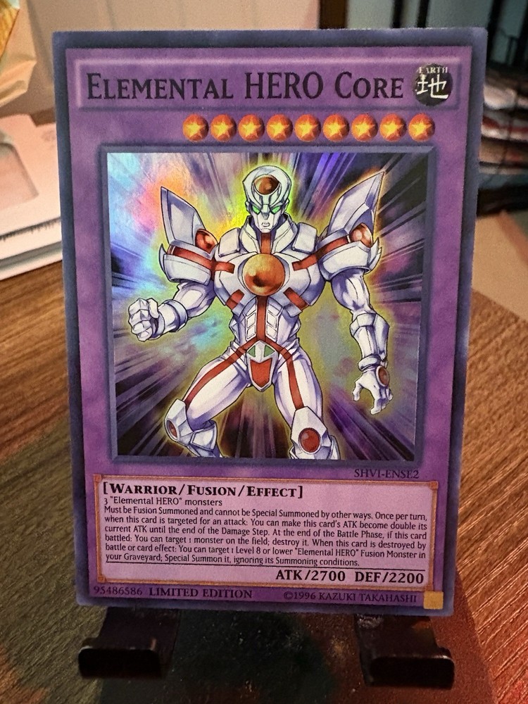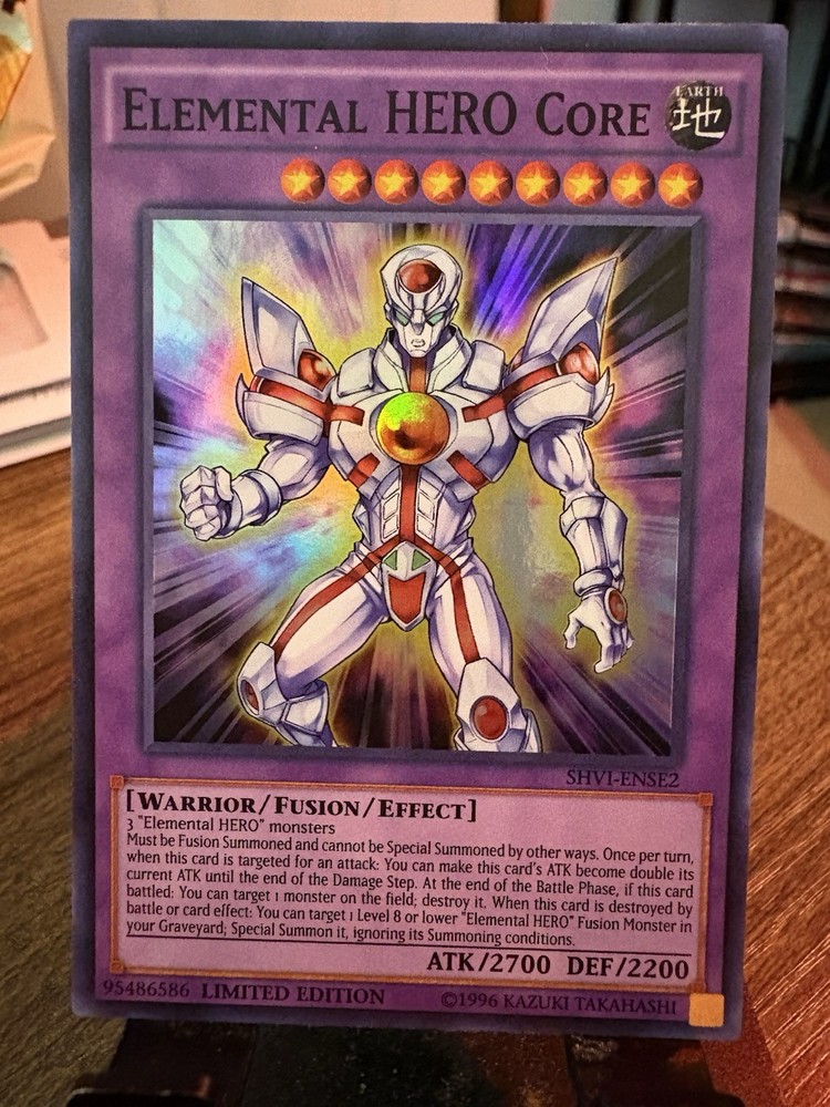 The Elemental Hero Core SHVI-ENSE2 Super Rare Limited Edition Yu-Gi-Oh! card is a highly sought-after collectible for fans of the Yu-Gi-Oh! TCG. This 1st Edition fusion card from the Shining Victories set, manufactured by Konami, features the iconic Elemental HERO Core design. With its vintage appeal and rarity, this English language card is sure to be a valuable addition to any collector's deck.