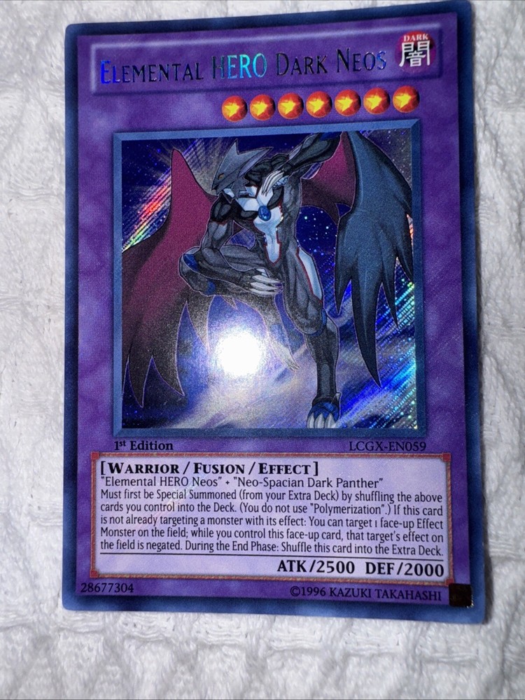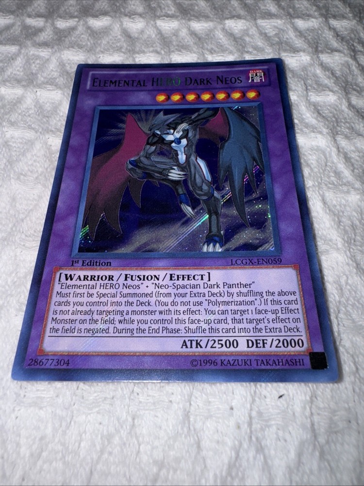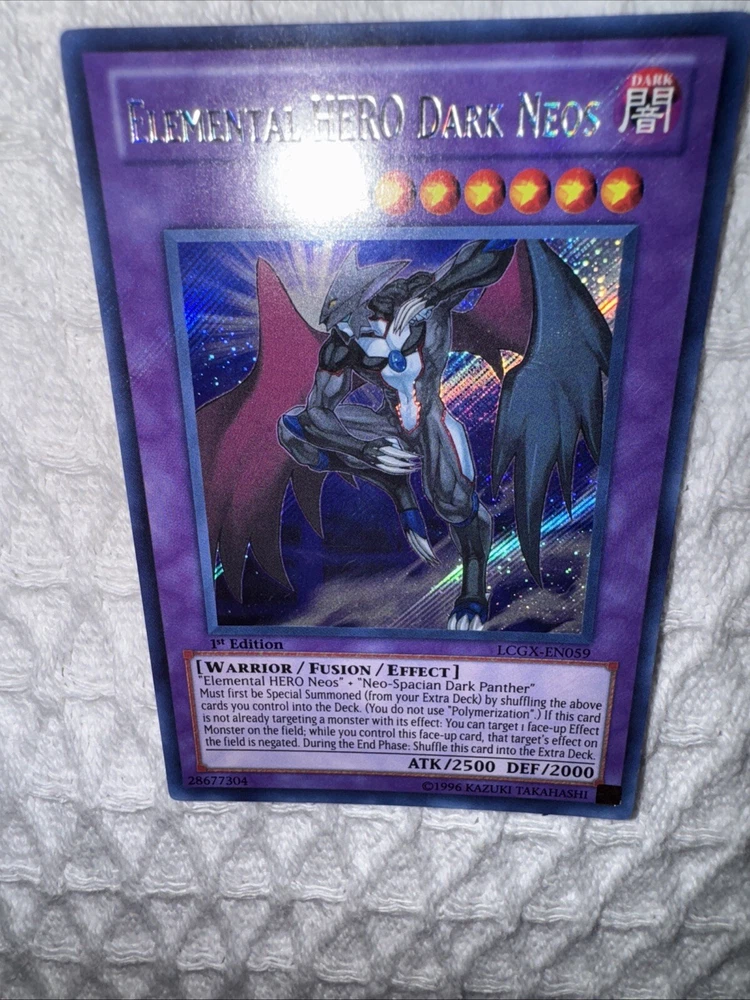 The product is a vintage English-language Yu-Gi-Oh! TCG card from the Legendary Collection 2: The Duel Academy Years set. It features Yugi Muto as the character and is a Secret Rare Elemental Hero Dark Neos monster card with a Holo finish. This Japanese-made card is a 1st Edition collectible on card stock material, showcasing the Darkness attribute and Warrior creature type. See pictures for condition
