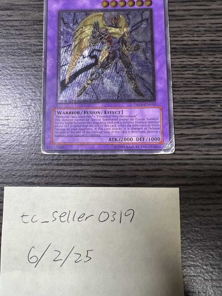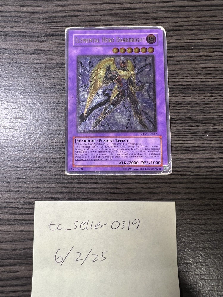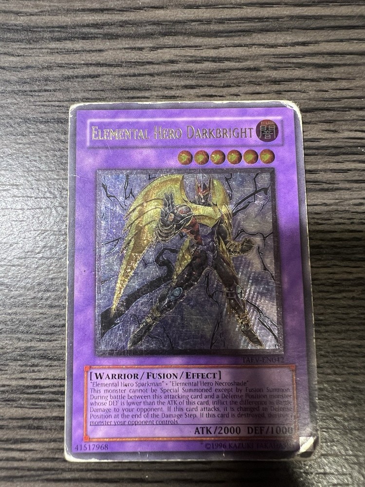 Just got this Elemental Hero Darkbright in ultimate rare—absolutely stunning! The 1st ed printing is crisp, and the near-mint condition is spot-on except for a tiny corner bump. Seller provided clear pics and offered extra details if needed. Fast shipping with tracking and secure packaging. Perfect for my binder—highly recommend this seller for Yugioh collectors!
