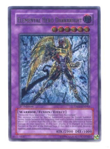 You are purchasing 1 Elemental Hero Darkbright - TAEV-EN042 - Ultimate Rare - Unlimited Edition from TAEV Tactical Evolution. This item is in the following condition: Condition: Moderate Play ATK/DEF : 2000/1000 Attribute : Dark Card Number : TAEV-EN042 Card Rules : Rulings powered by The Netrep Card Text : 'Elemental Hero Sparkman' + 'Elemental Hero Necroshade' This monster cannot be Special Summoned except by Fusion Summon. During battle between this attacking card and a Defense Position monster whose DEF is lower than the ATK of this card, inflict the difference as Battle Damage to your opponent. If this card attacks, it is changed to Defense Position at the end of the Damage Step. If this card is destroyed, destroy 1 monster your opponent controls. Card Type : Fusion/Effect Monster Edition : Unlimited Level : 6 Monster Type : Warrior Name : Elemental Hero Darkbright Passcode : 41517868 Pendulum Scale : Rarity : Ultimate Rare Set : Tactical Evolution I ship world wide. Shipping in the United States is FREE. Shipping outside of the United States is as follows: Orders under $40.00 are shipped for $7.00. Orders between $40.00 and $100.00 are shipped for $20.00 using USPS Registered mail. Orders over $100.00 are shipped for $45.00 using USPS International Express Mail, and insured for the full value. All orders going outside of the United States will have the full value declared on the customs form. I am not responsible for any fees that you are charged outside of the payment you send to me. I am not responsible for customs fees, import duties, tariffs or taxes. These are the responsibility of the recipient. These shipping policies are non-negotiable. We do reserve the right to limit any buyer to 4 copies of the same card without prior consent. If you purchase more than 4 of any single item, you may be refunded for all but 4 of that card. Thank you for shopping in my ebay store.