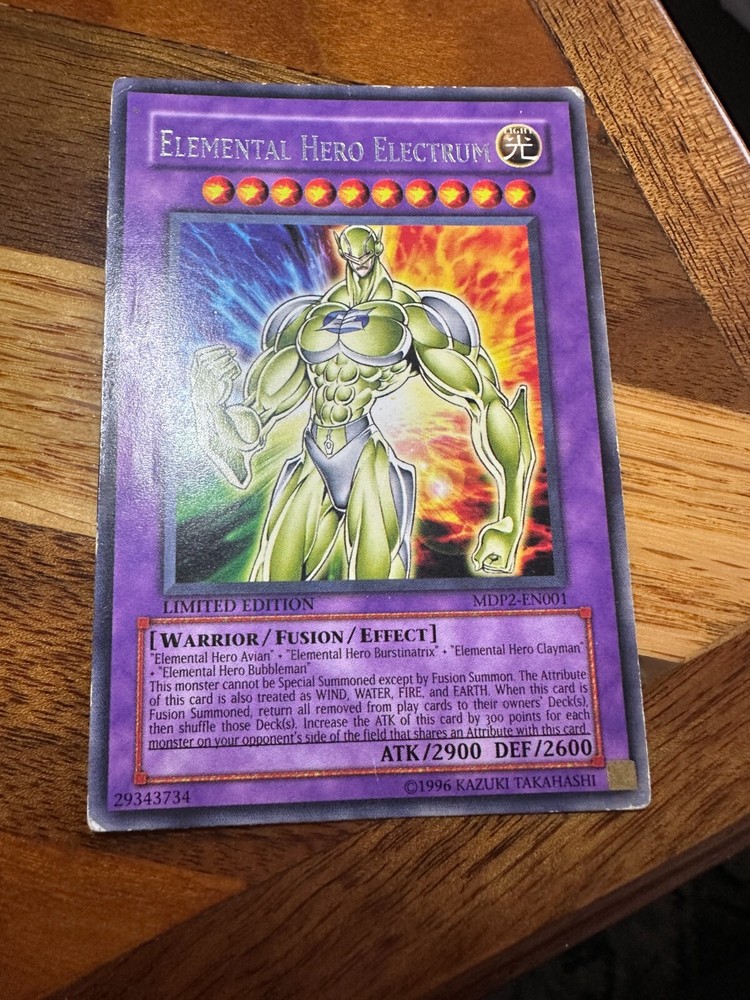 Hello! You are buying one Elemental Hero Electrum MDP2-EN001 Limited Edition Rare i n heavily played condition. Reason for heavily played condition is general play/edge/scratchwear, some bendwear. See photos for details! As a thank you for buying from me, I will throw in two free Yugioh commons! Thank you so much for looking, have a great day! If there is ever an issue, please let me know so I can do whatever I can to resolve it! Please check out my other items! I have many more single cards!