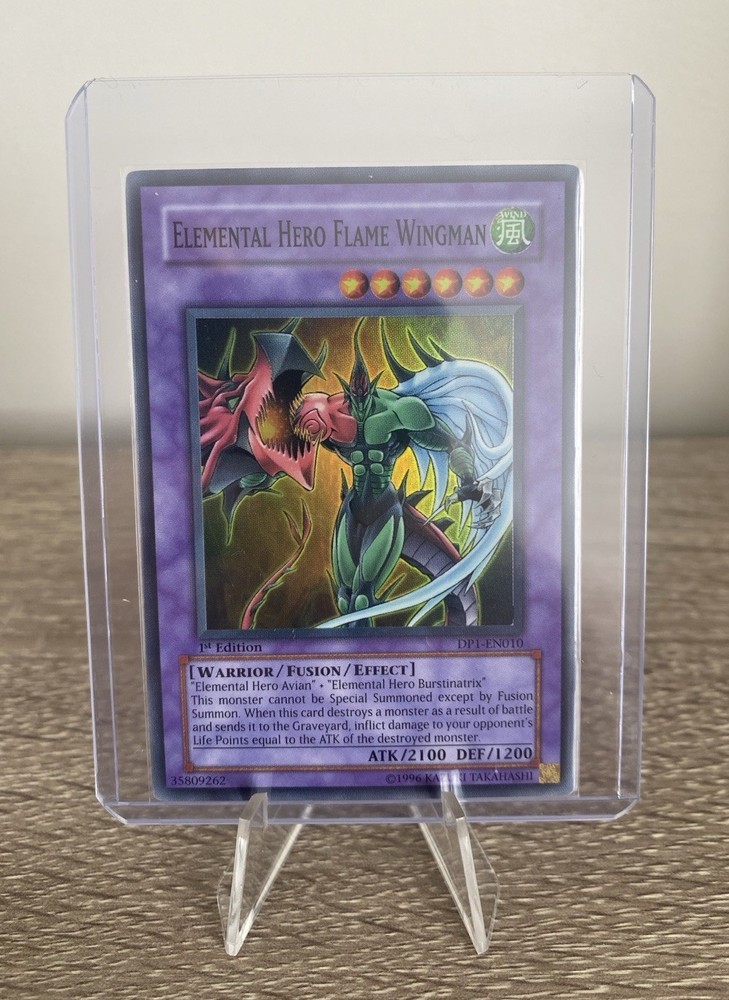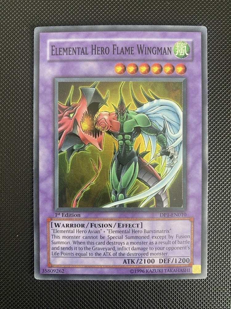 Elemental Hero Flame Wingman Yu-Gi-Oh TCG DP1-EN010 1ST EDITION Super Rare LP Will be shipped in Japanese penny sleeve, top loader, and bubble mailer for protection. Please note any card defects you may see before purchasing, as there are no returns. Tracking is not provided unless requested, at buyer's expense.