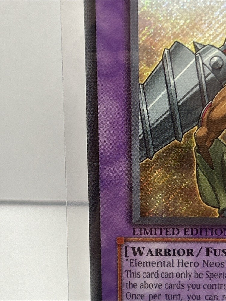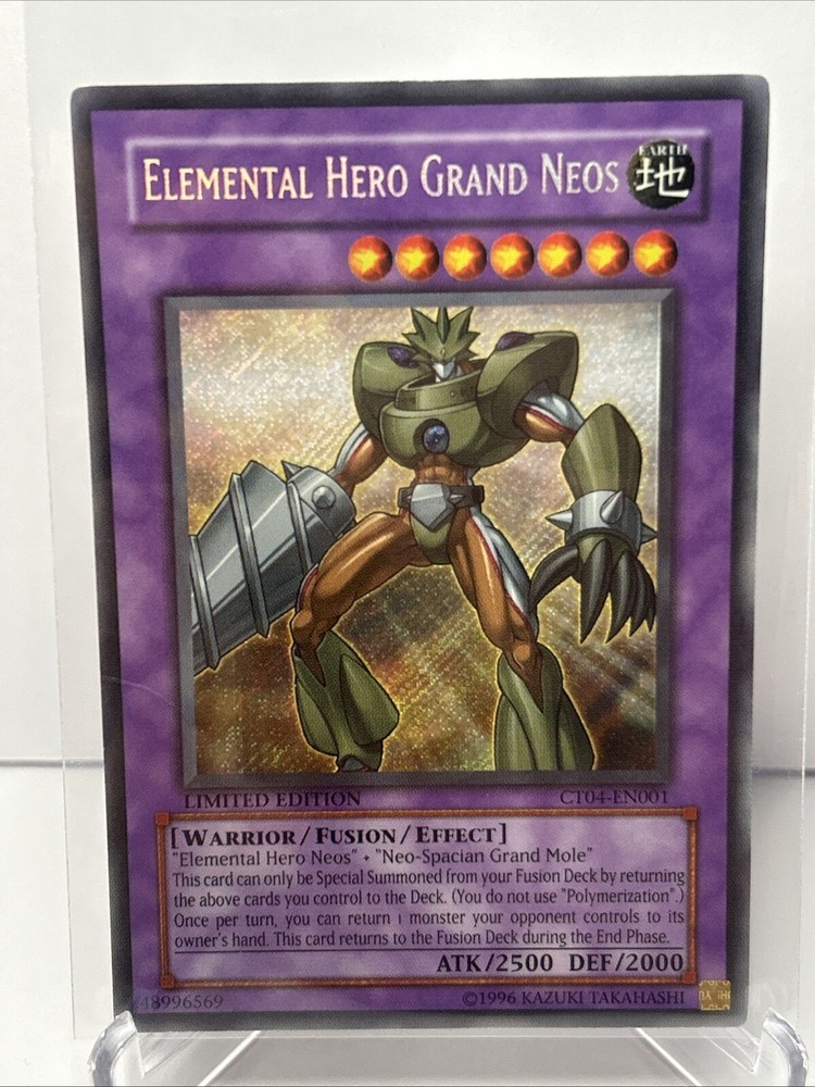 The product is a Secret Rare Limited Edition card from the 2007 Collectors Tins set of the Yu-Gi-Oh! TCG. The card is Elemental Hero Grand Neos, a popular card among collectors and players. It is highly sought after for its rarity and unique design, making it a valuable addition to any Yu-Gi-Oh! card collection. Creases on side see pics YG 42