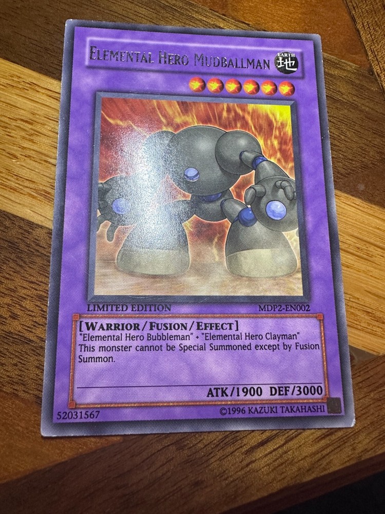 Hello! You are buying one Elemental Hero Mudballman MDP2-EN002 Limited Edition Rare in played condition! Reason for played condition is general play/edge/scratchwear. See photos for details! As a thank you for buying from me, I will throw in two free Yugioh commons! Thank you so much for looking, have a great day! If there is ever an issue, please let me know so I can do whatever I can to resolve it! Please check out my other items! I have many more single cards!